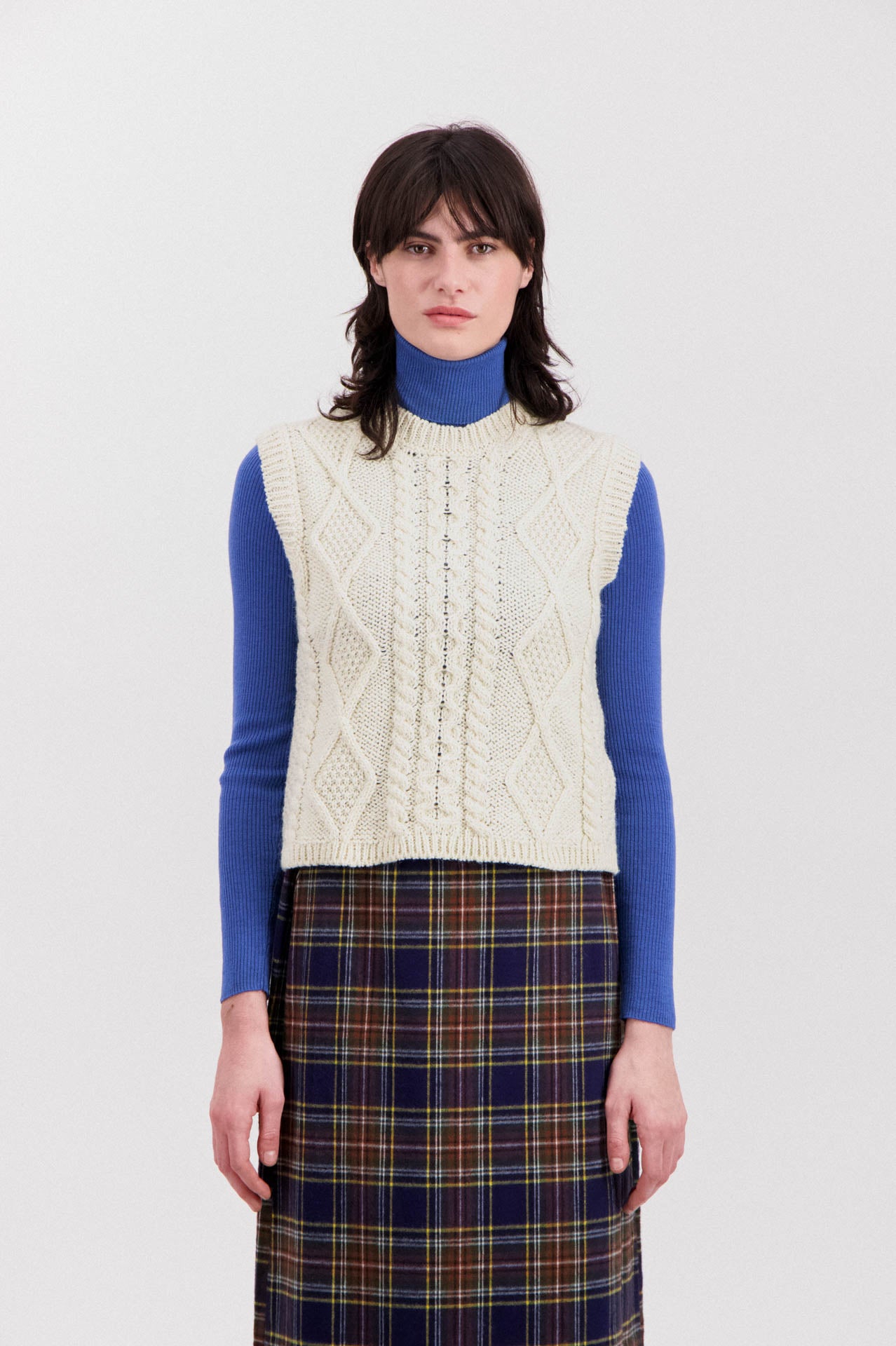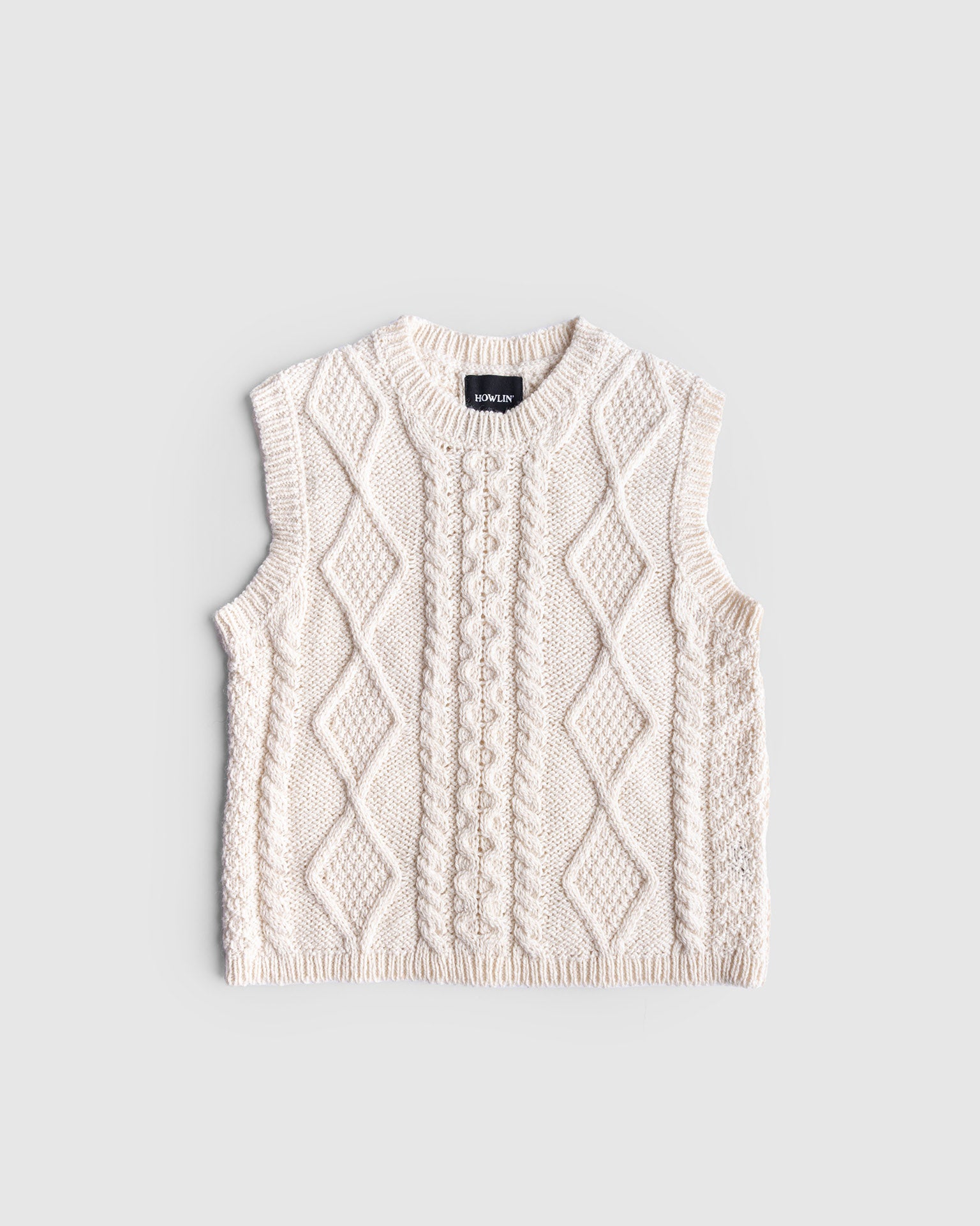 The Belle de Jour is a crewneck slipover from Howlin’ knitted in Ireland, featuring an intricate cable pattern.