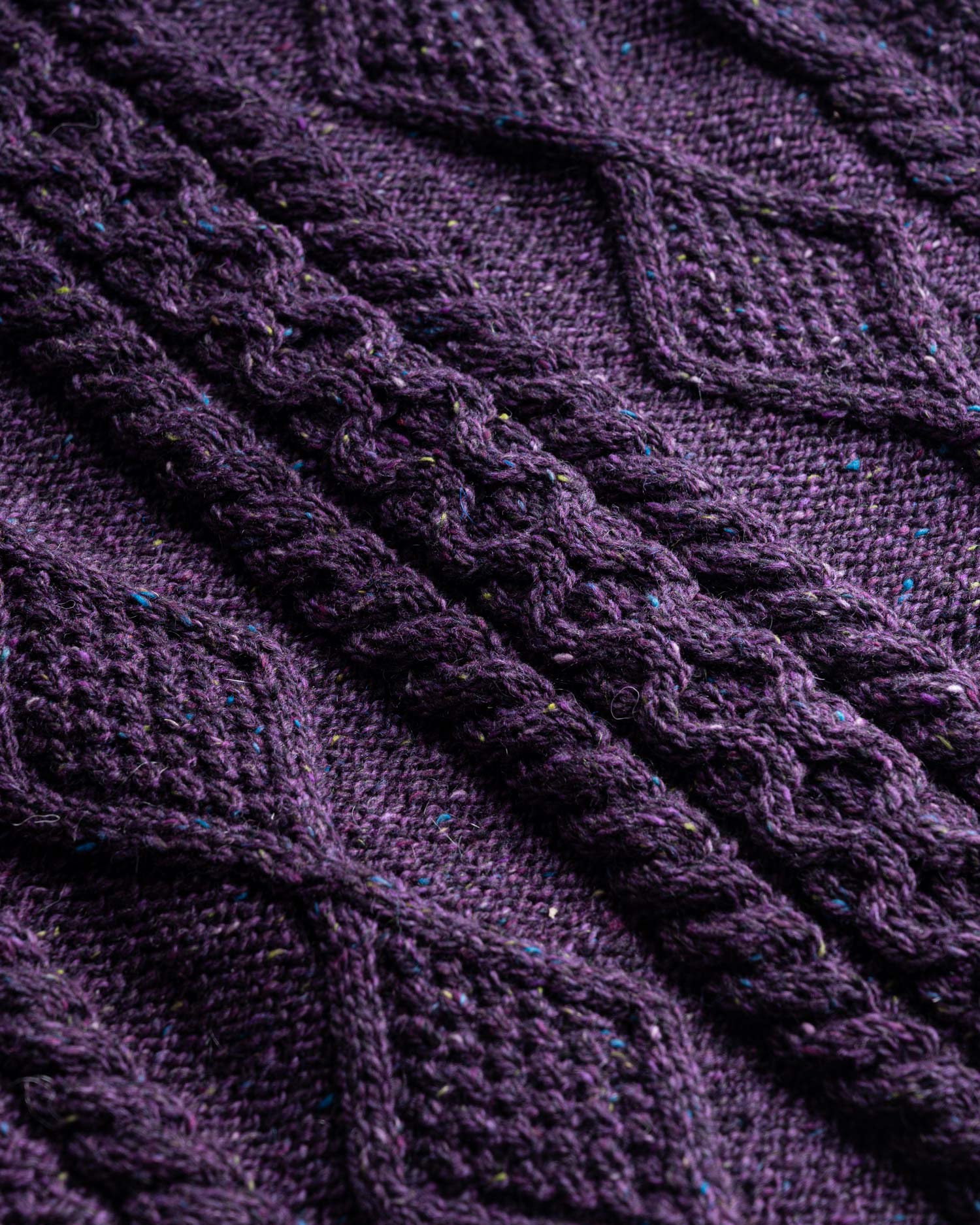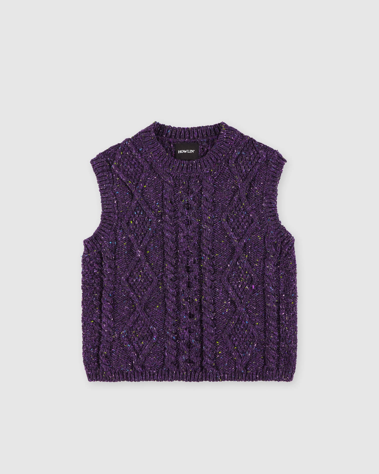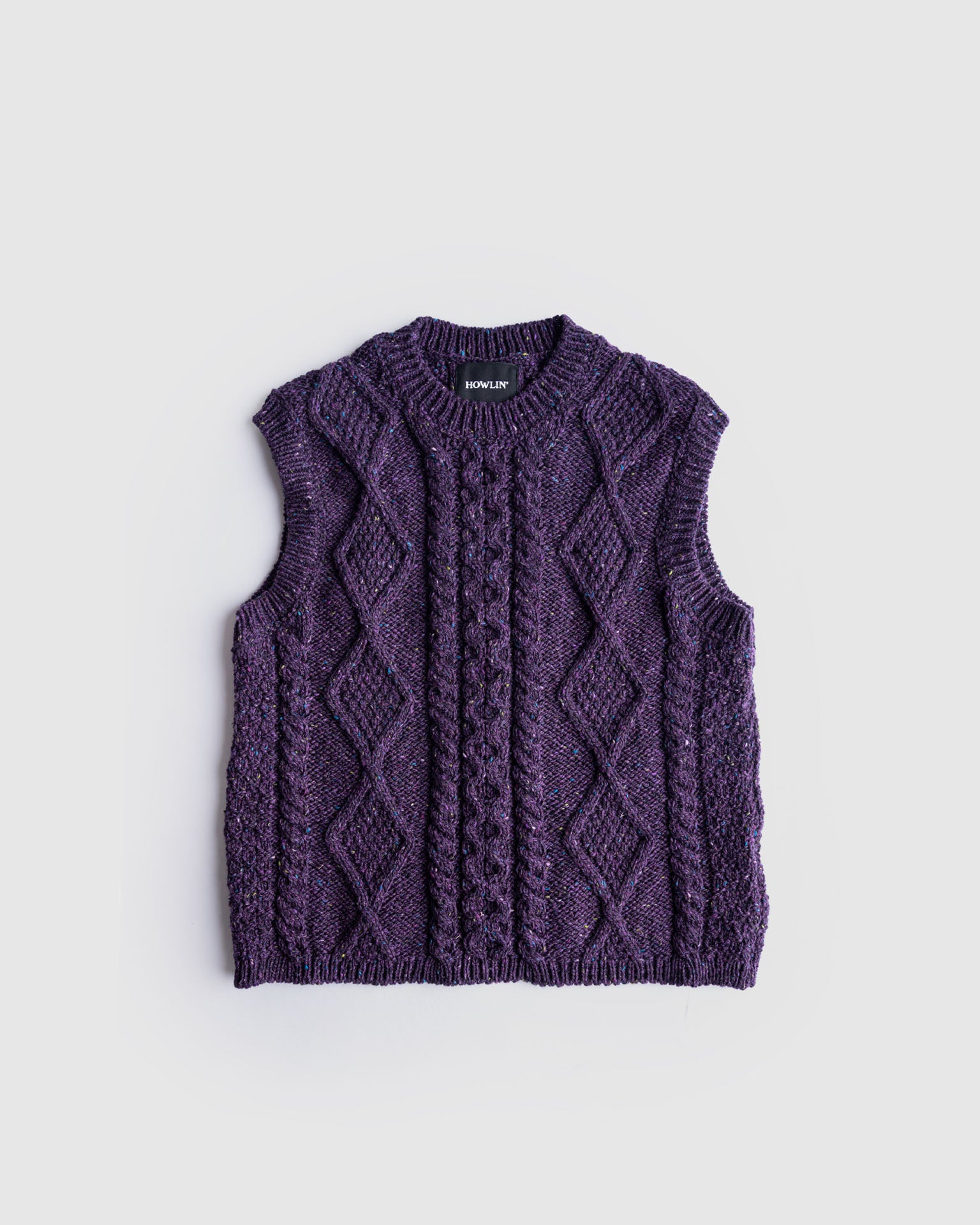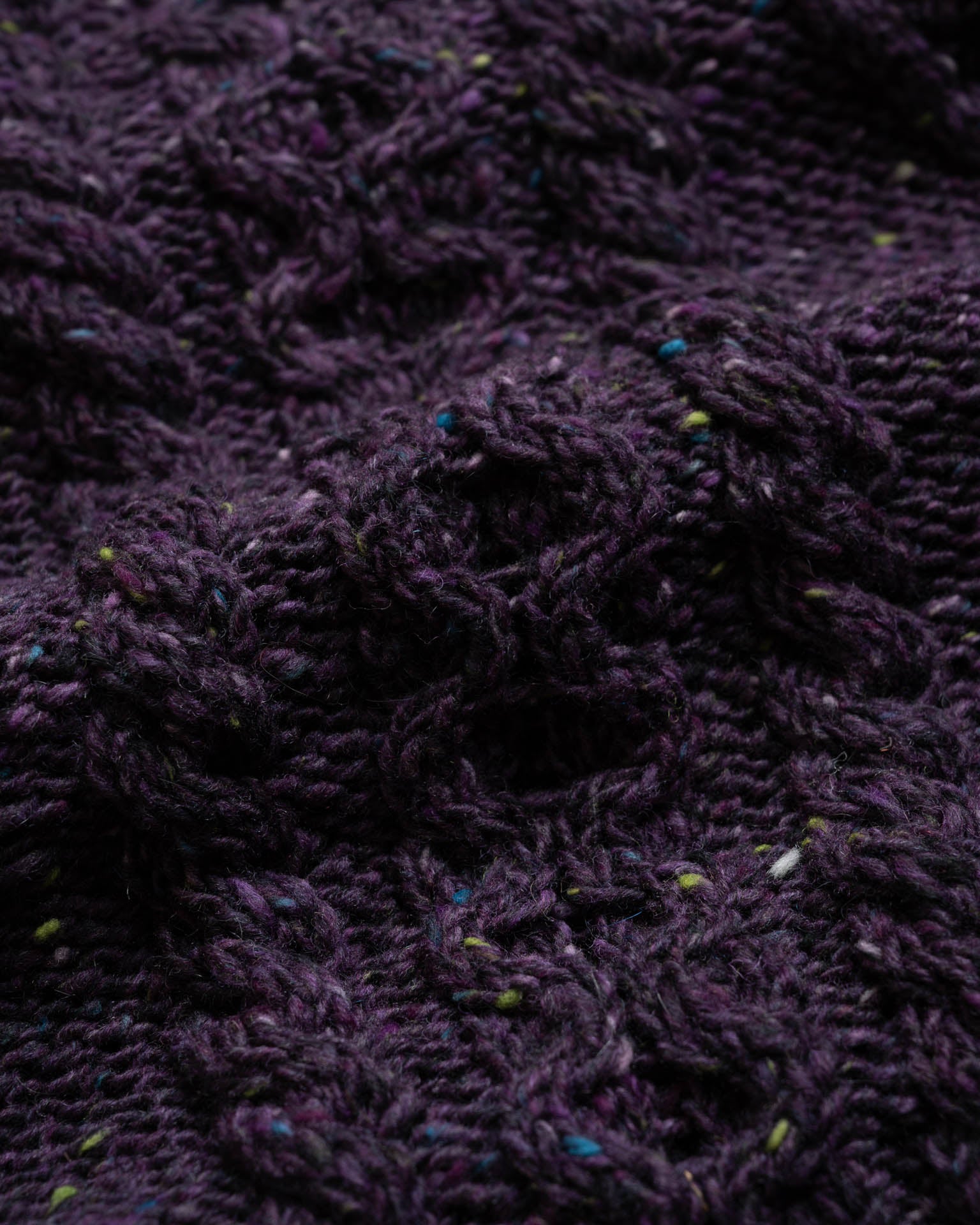 The Belle de Jour is a crewneck slipover from Howlin’ knitted in Ireland, featuring an intricate cable pattern.