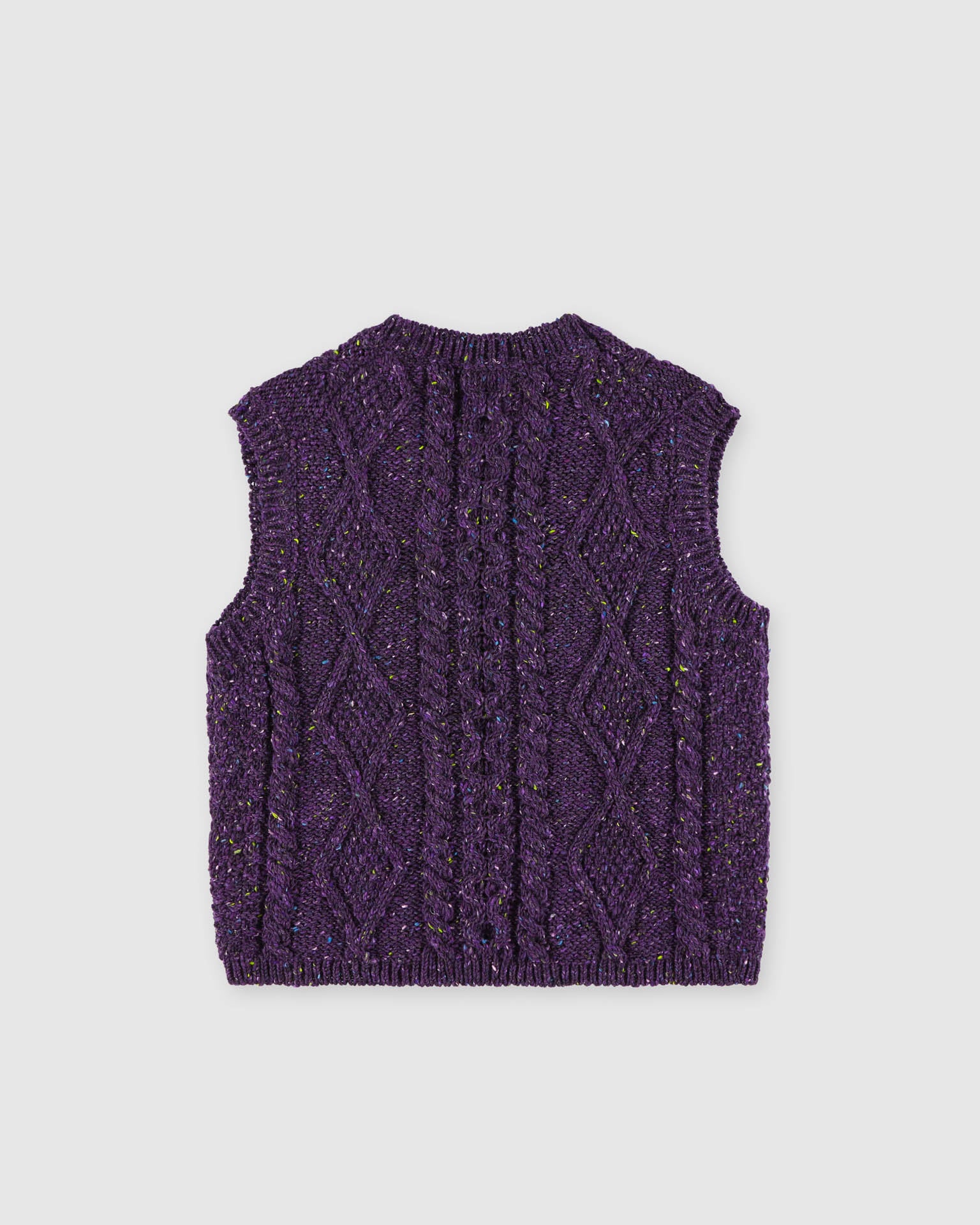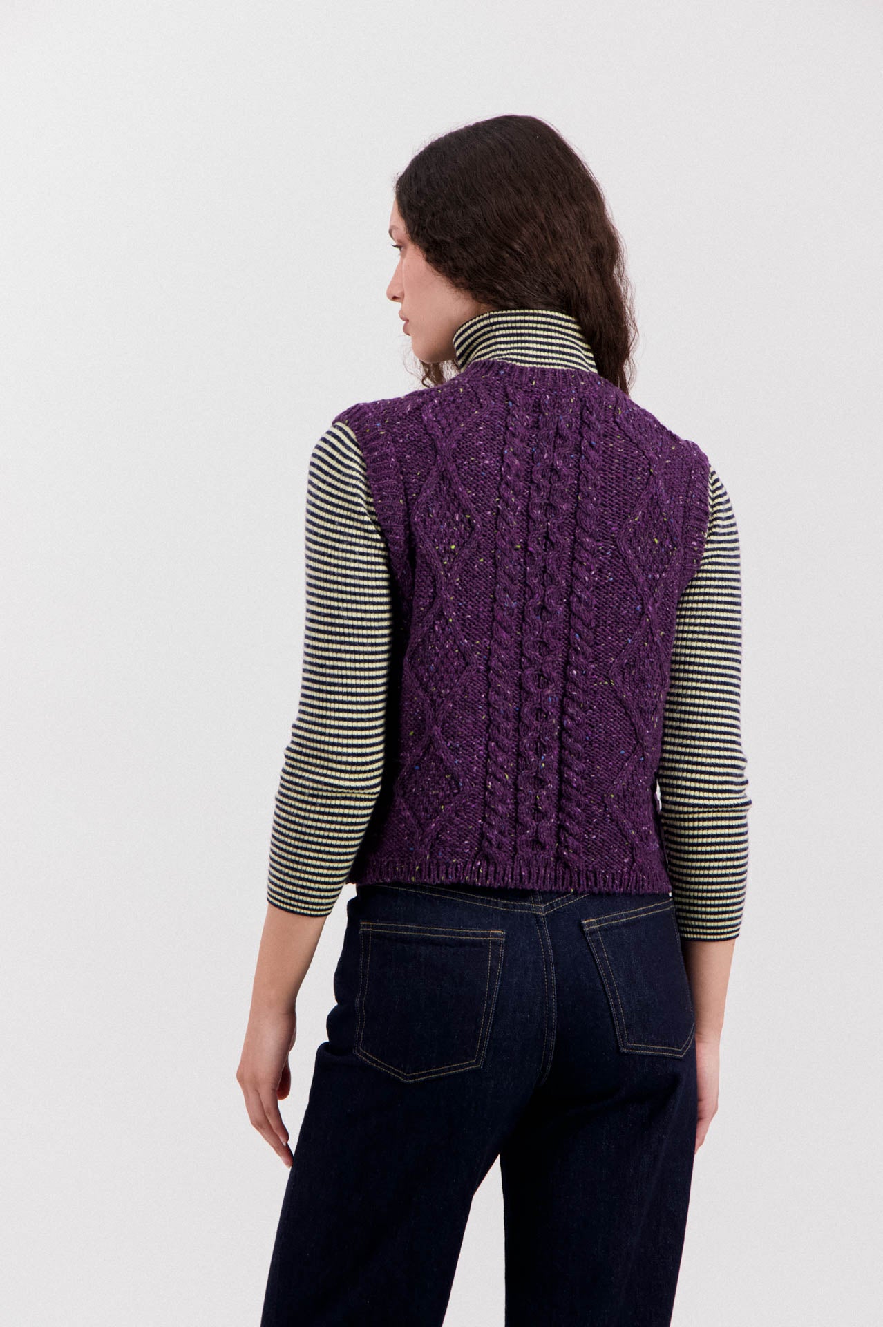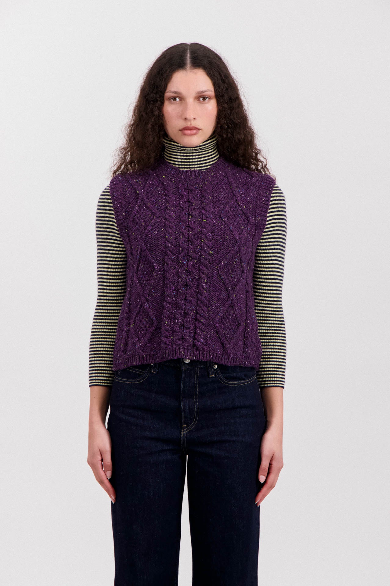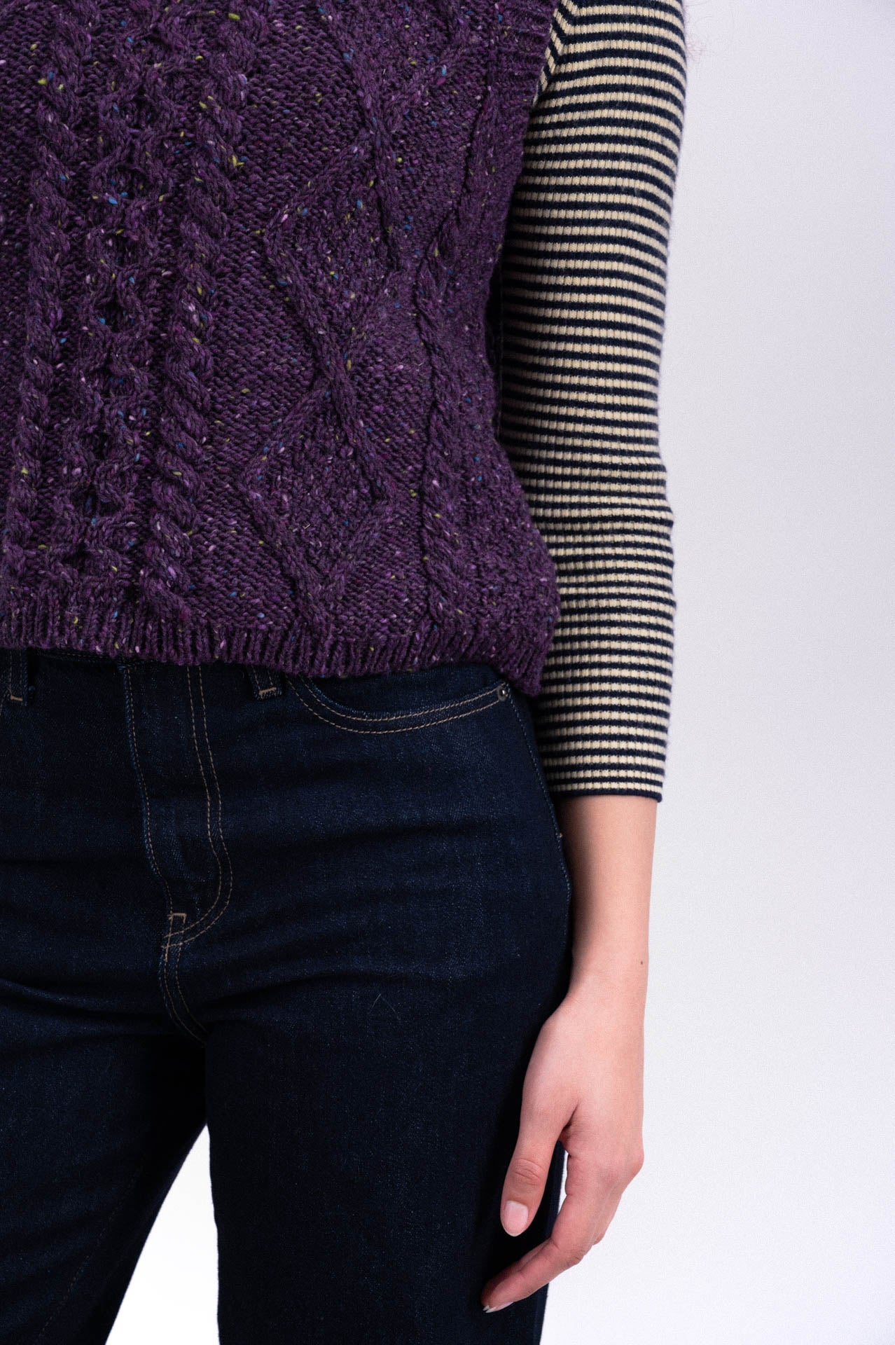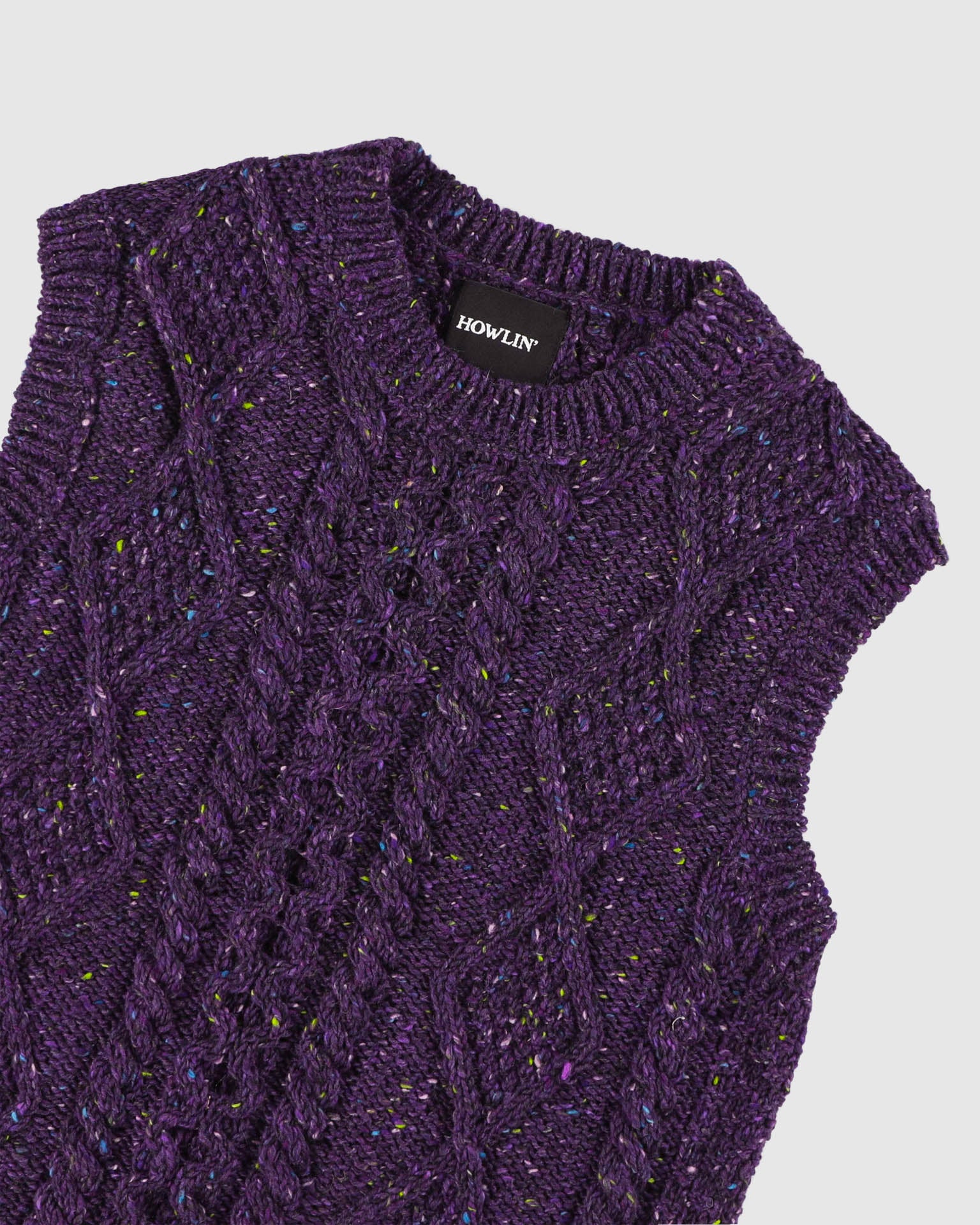 The Belle de Jour is a crewneck slipover from Howlin’ knitted in Ireland, featuring an intricate cable pattern.