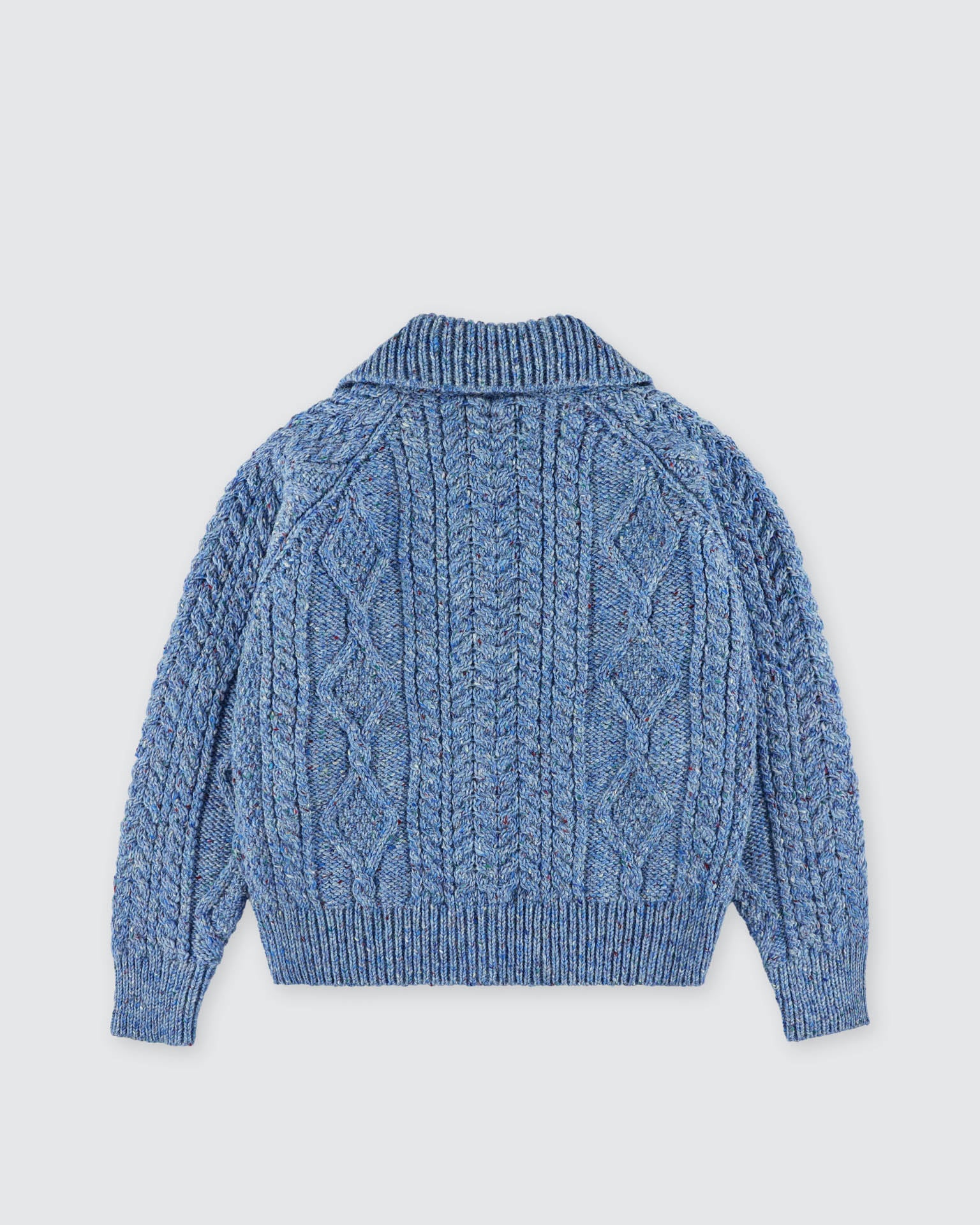 Bubbling Love is a timeless cardigan made in Ireland using an exclusive, UK-sourced chunky tweed yarn that brings together traditional techniques such as cable knitting with a playful spirit.