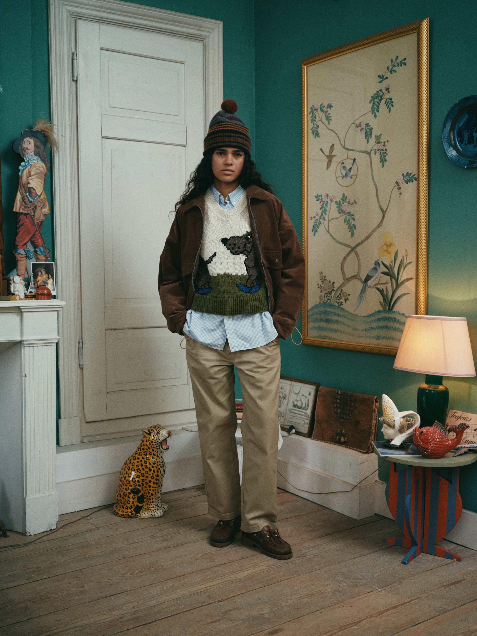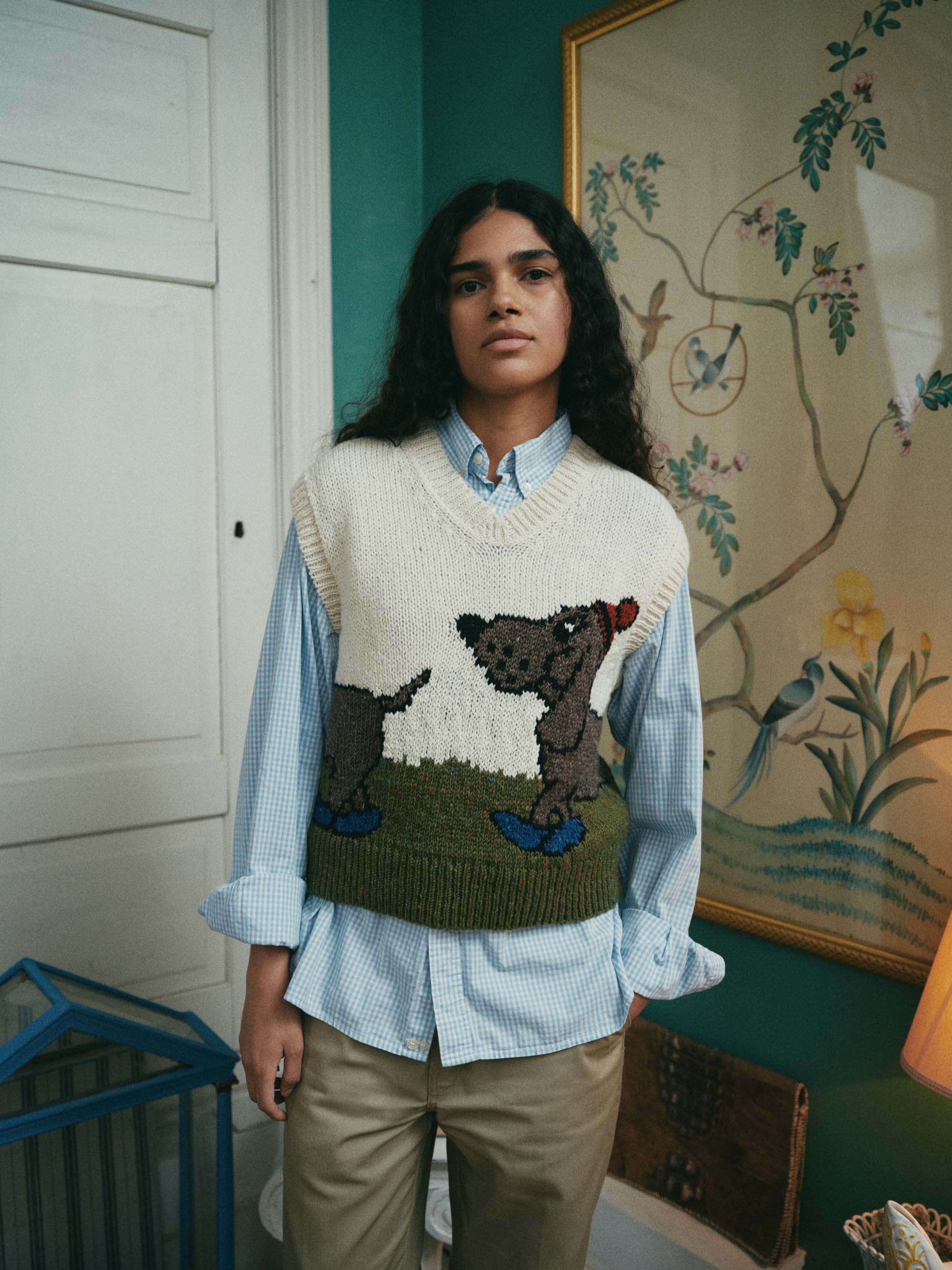 Bumper Lover is a delightful slipover from Howlin’ crafted in Ireland. Featuring a long, cartoon-style dachshund in blue booties and a red beanie, this V-neck slipover delivers comfort the Howlin’ way.