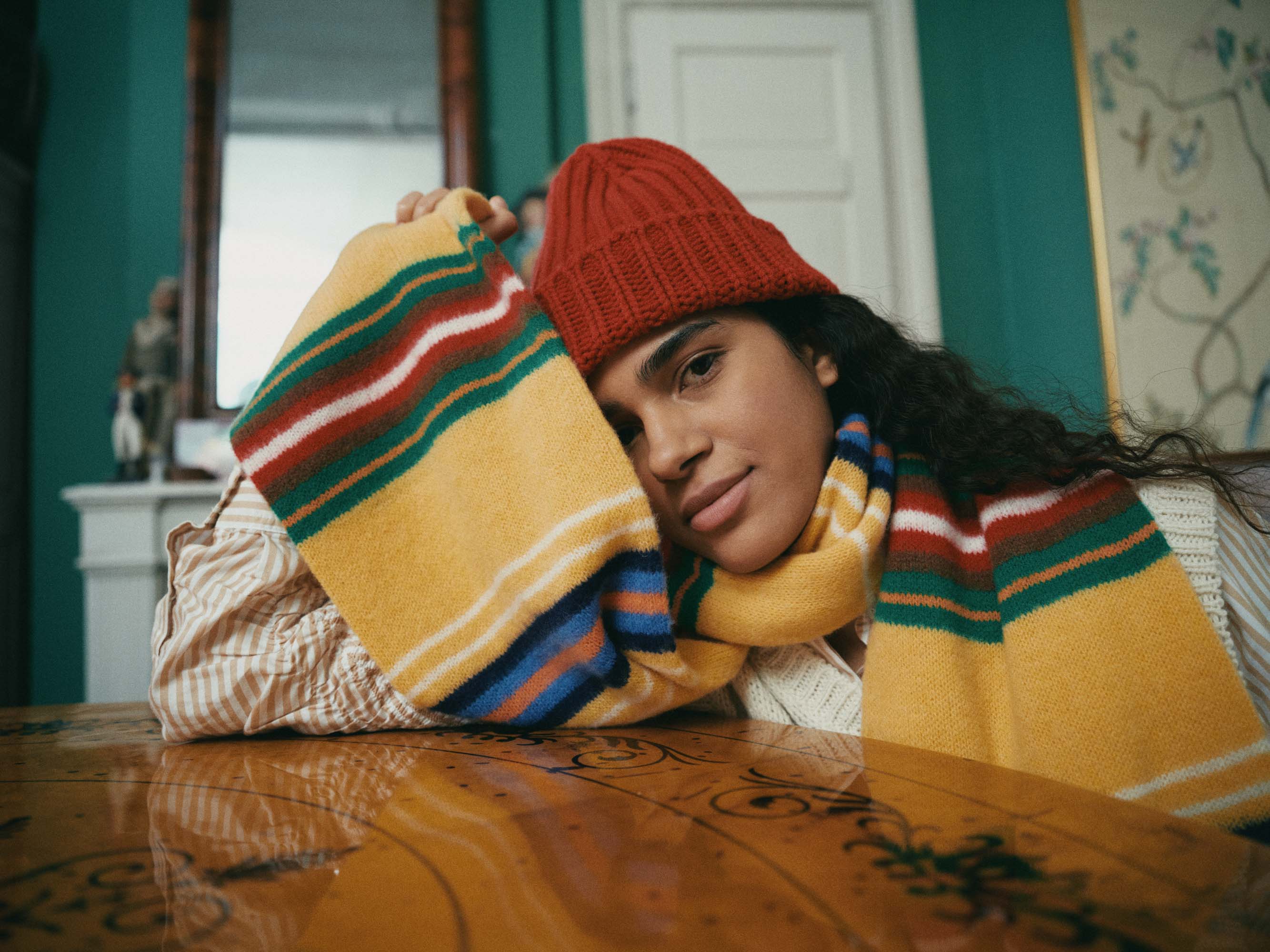 Howlin’s College Fun Scarf is a striped scarf crafted in Scotland with a 100% natural lambswool yarn.