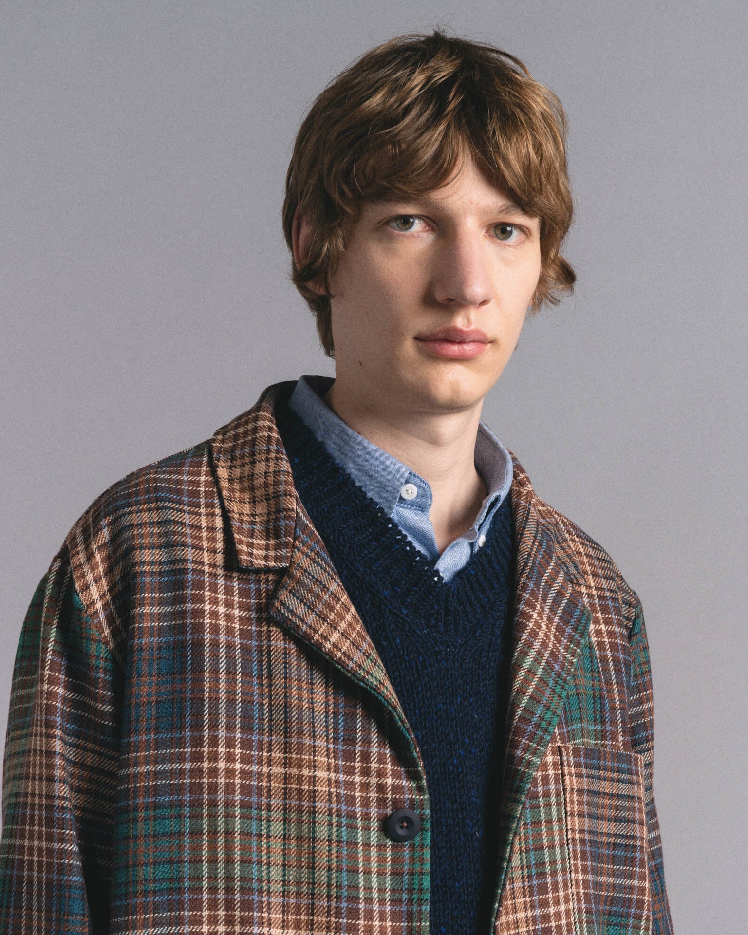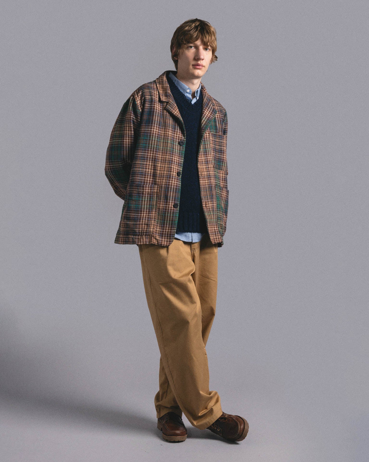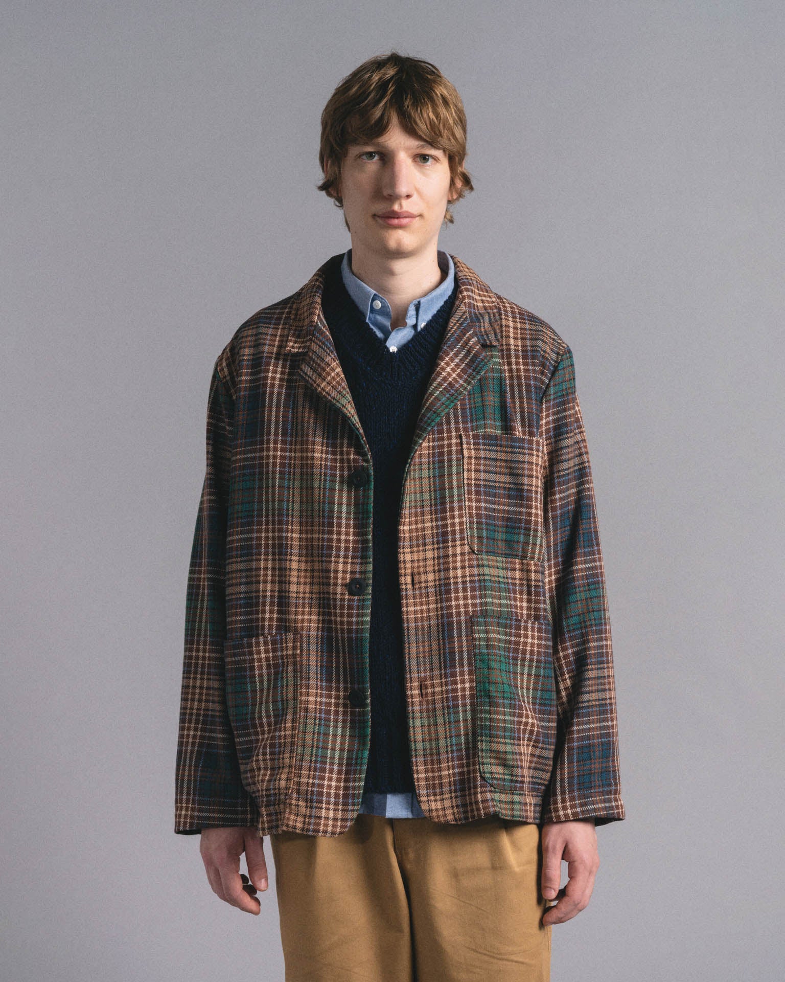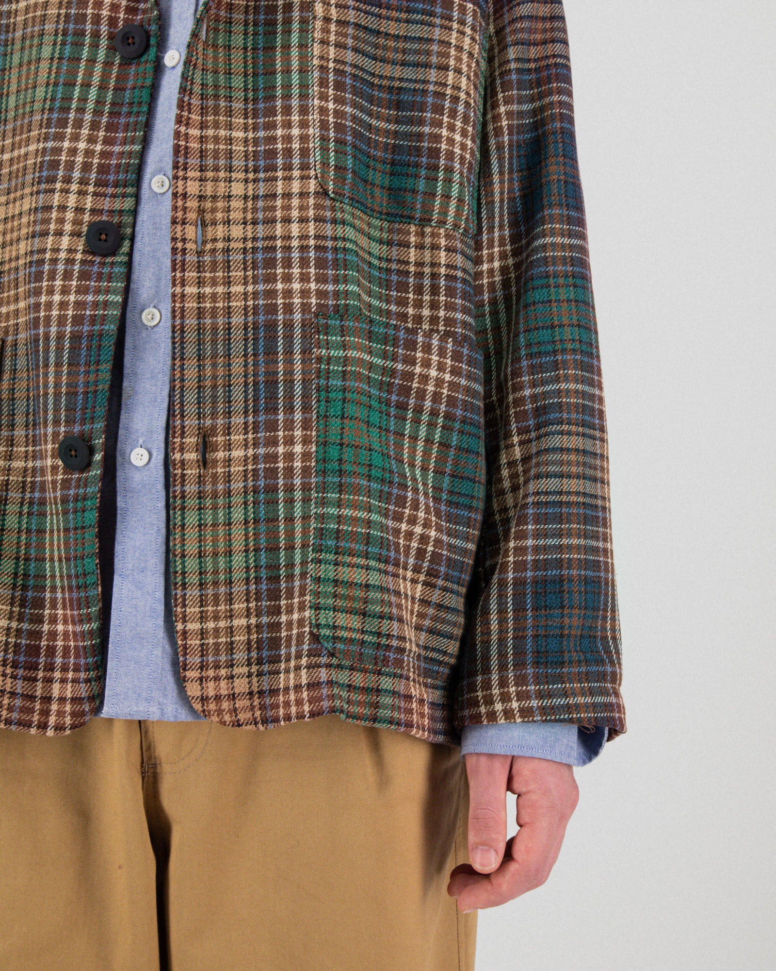 Cut from an exclusive premium Japanese yarn-dyed cotton twill, this jacket features a rich check pattern with deep, woven-in colours. The fabric has a soft yet structured feel, ideal for layering or wearing on its own across seasons.