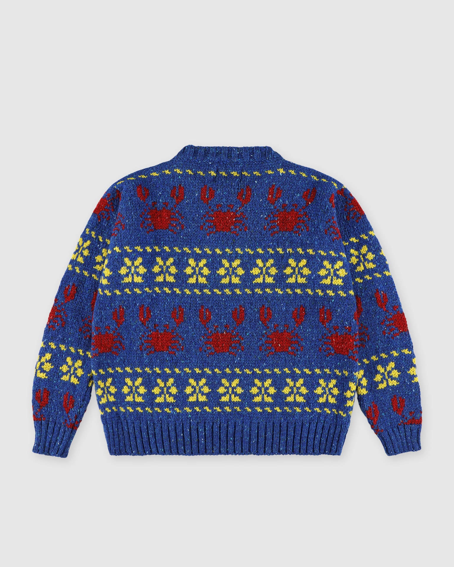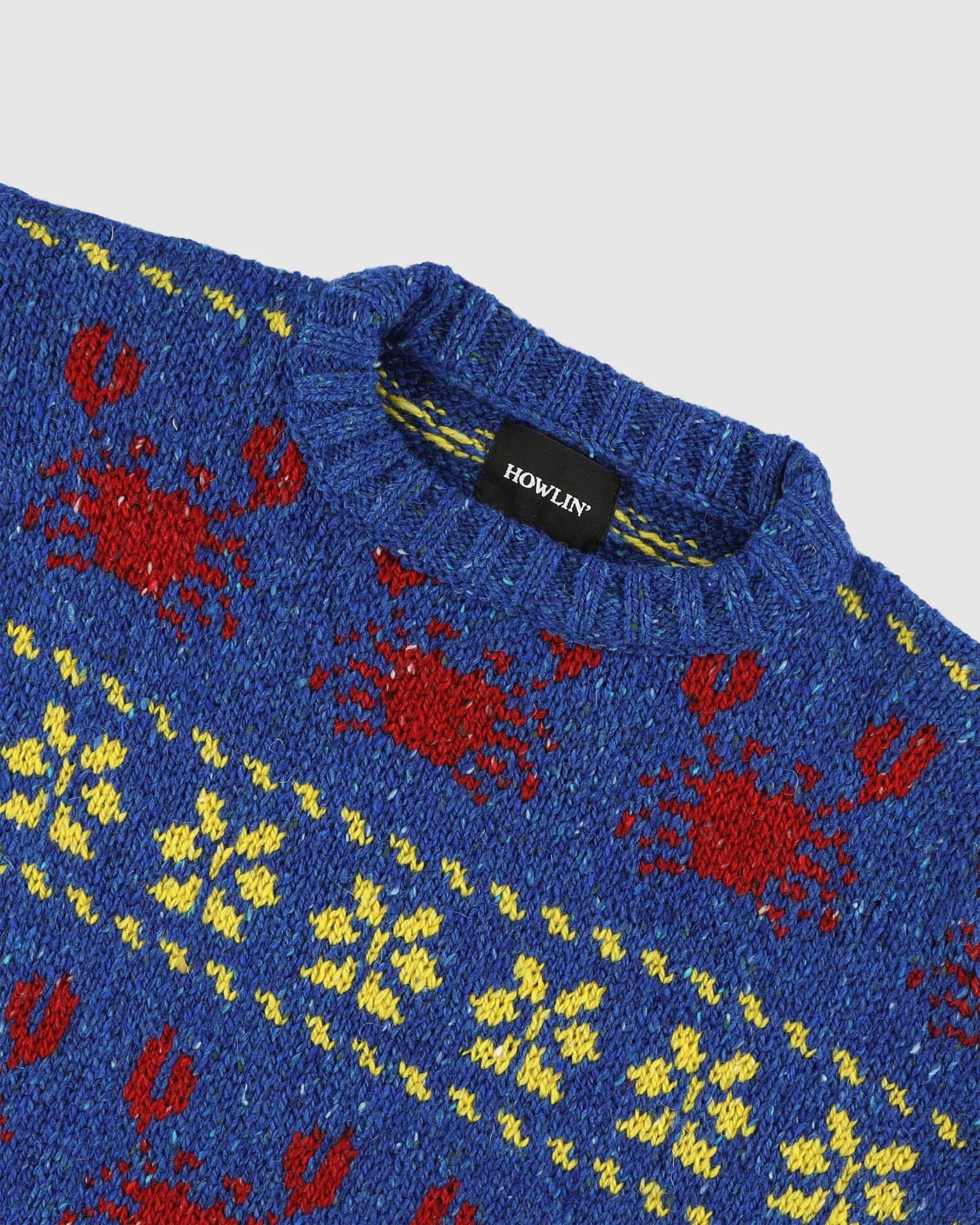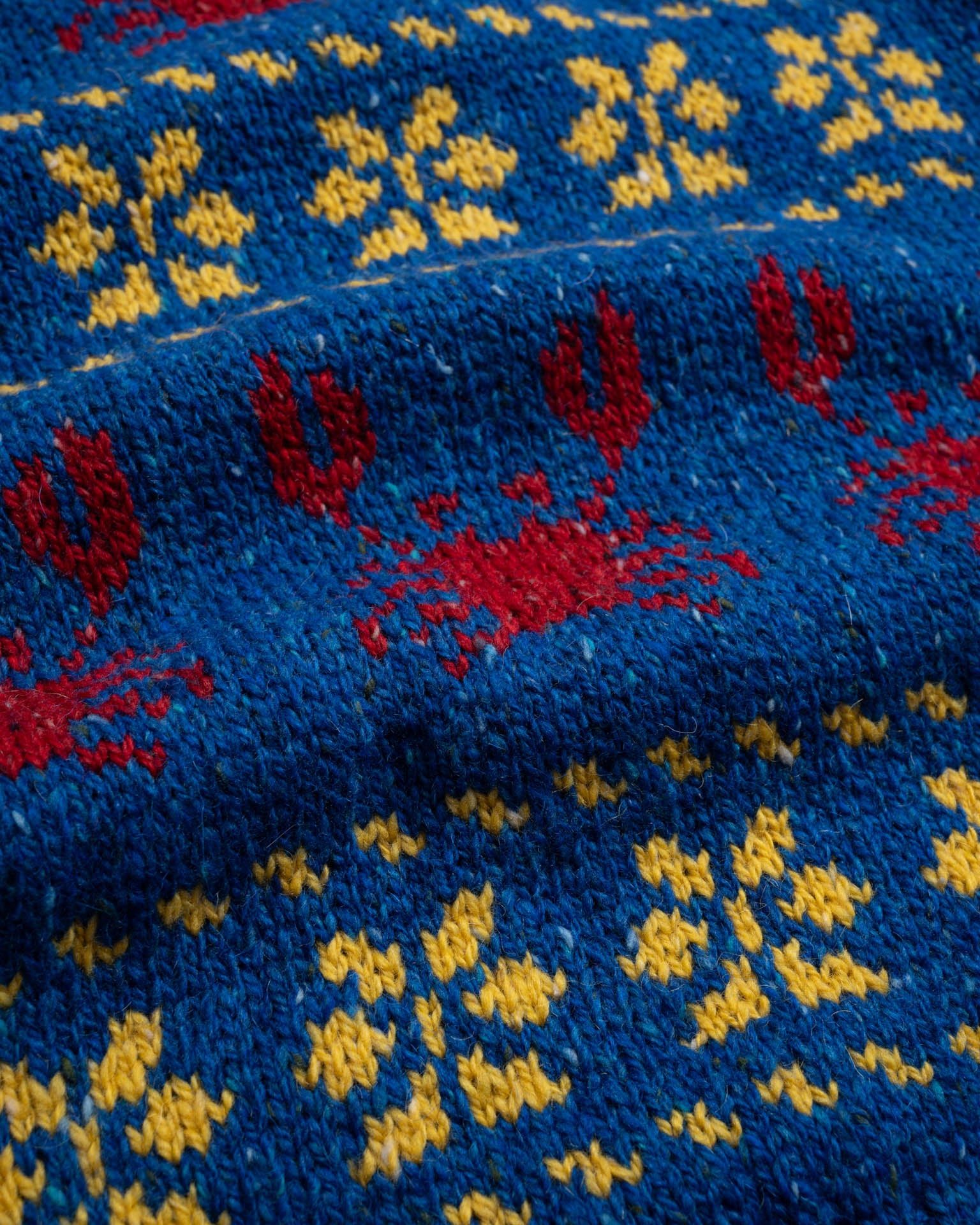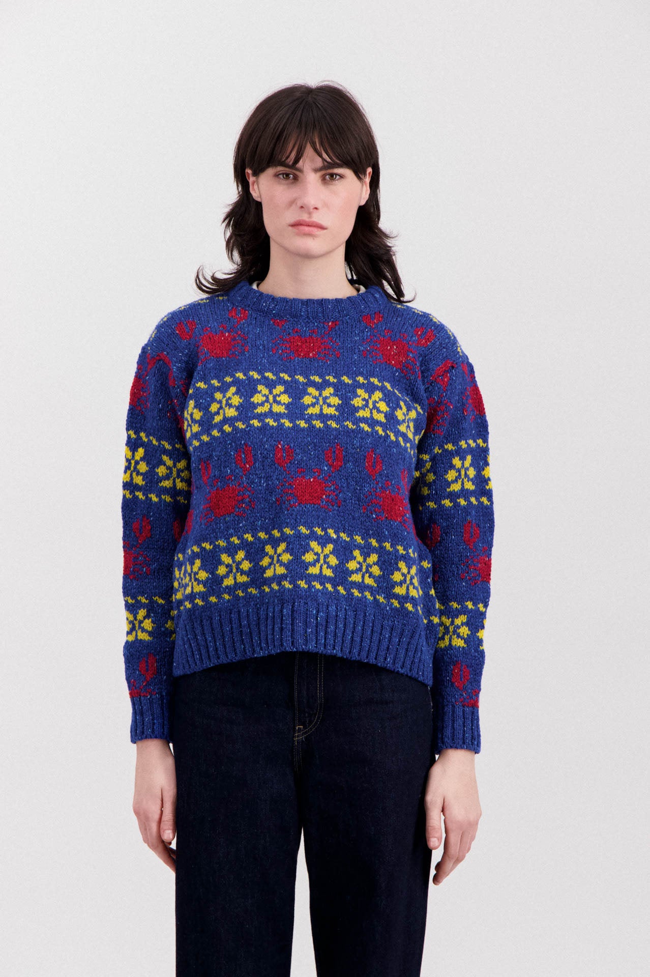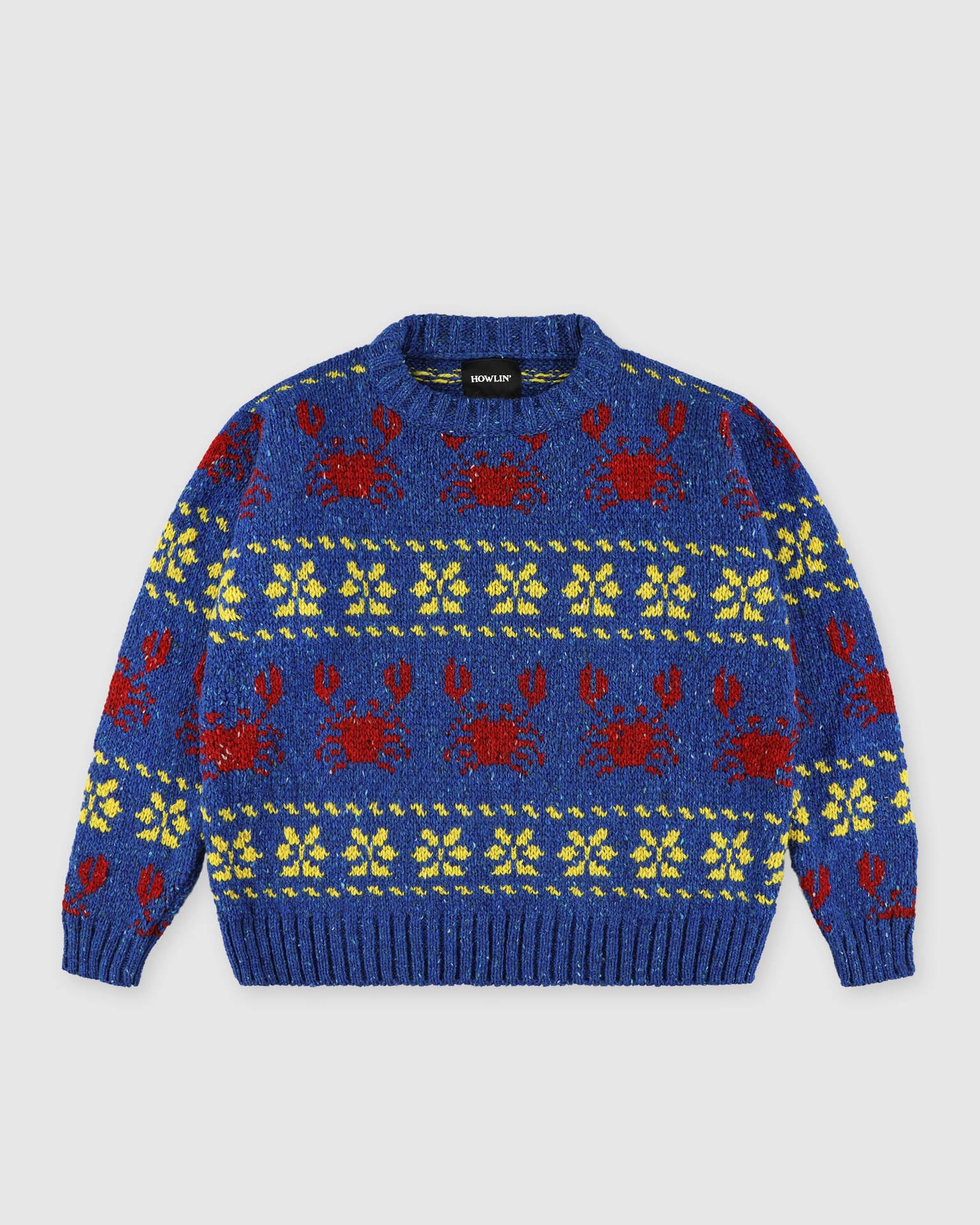 Crabs in Space, a funky knit from Howlin’ knitted in Ireland, featuring a repeating pattern of crabs and geometric motifs