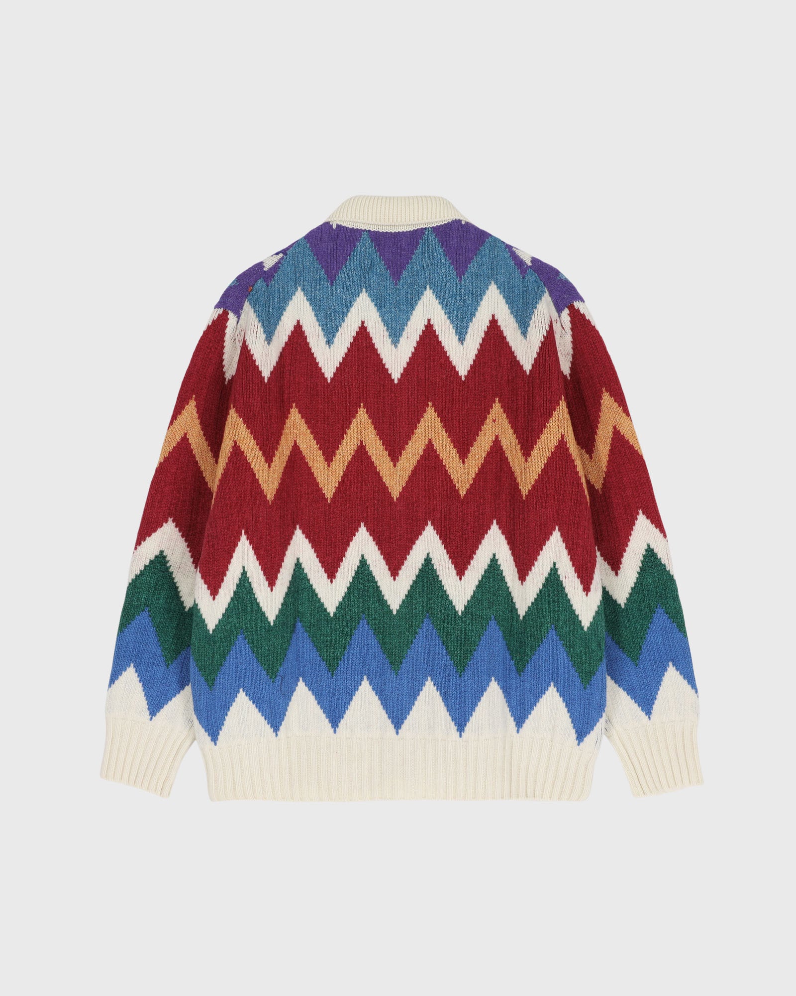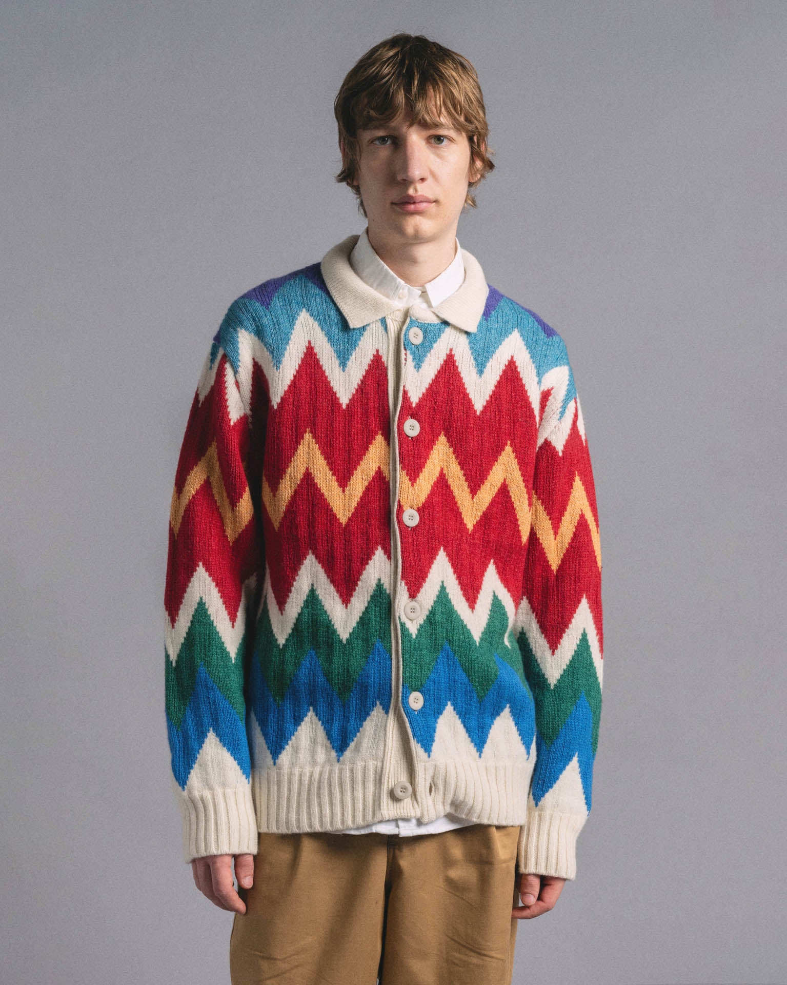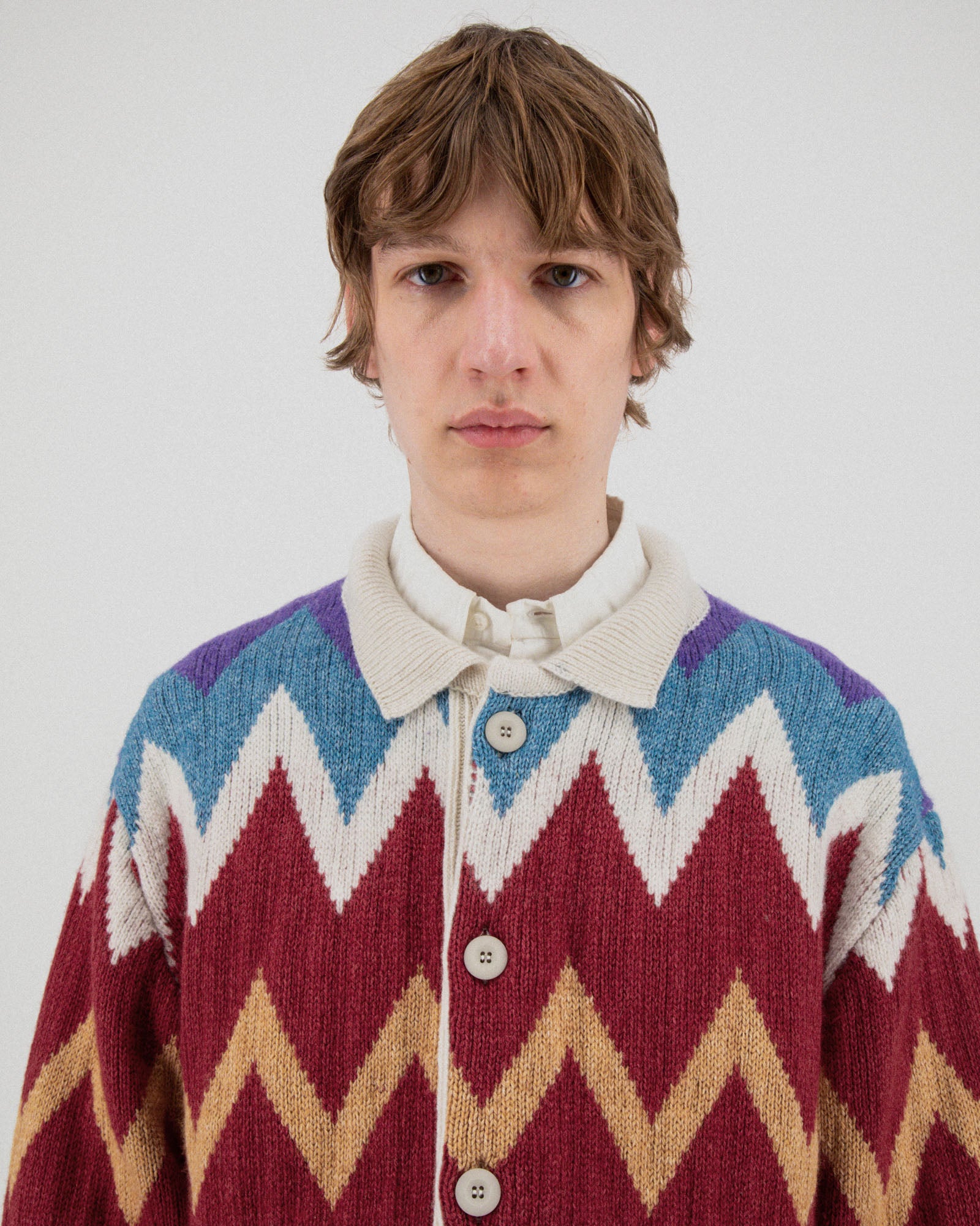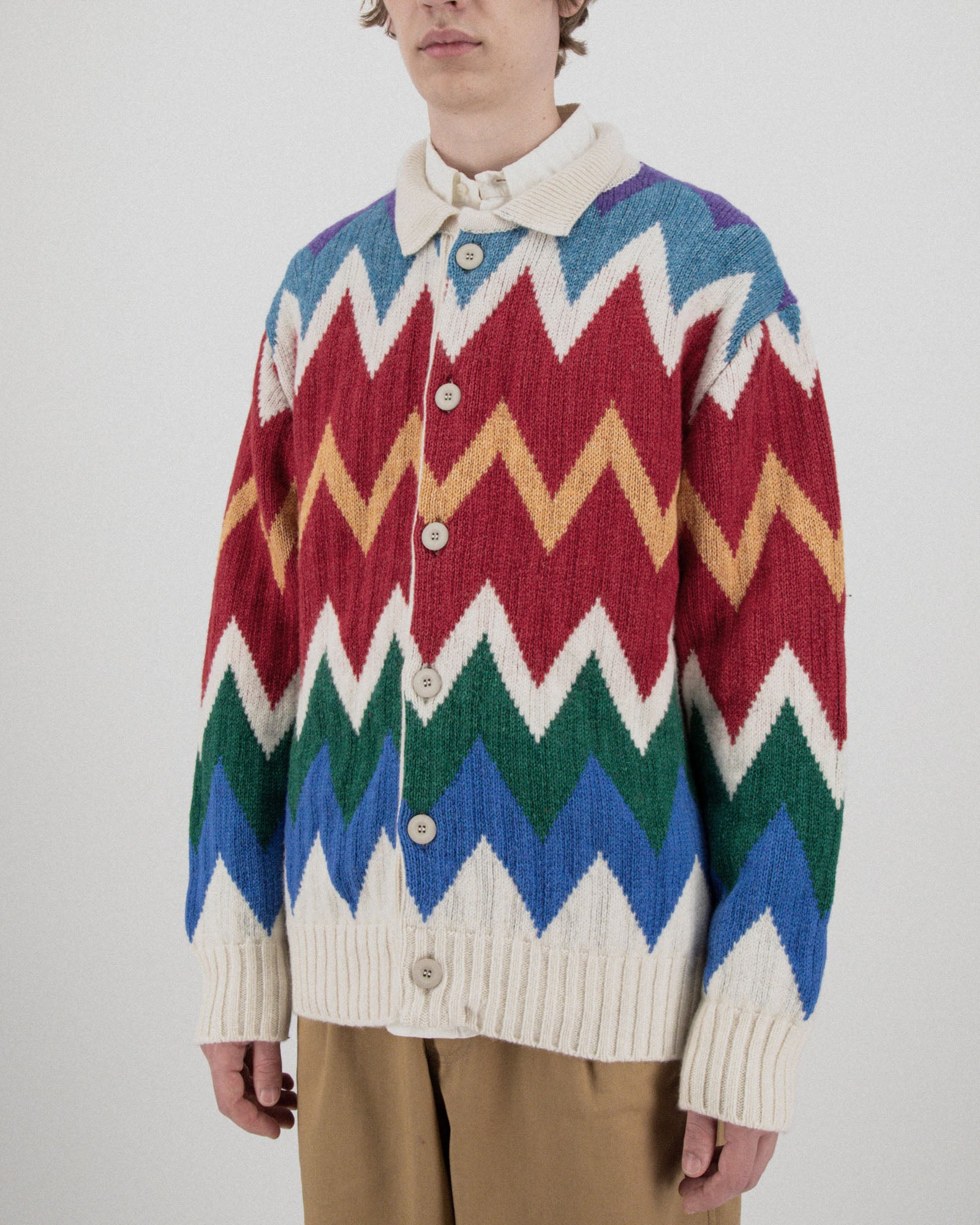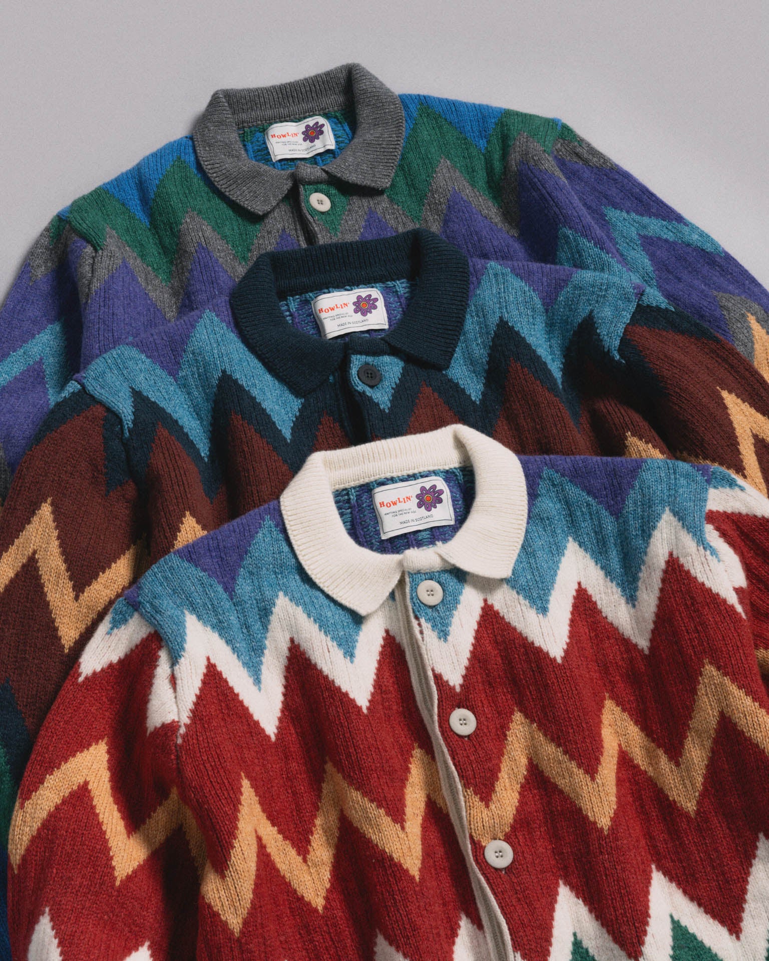Dark Star Cardigan is a zig-zag-patterned, buttoned-up cardigan with a polo collar made from organic cotton and lambswool in Scotland.