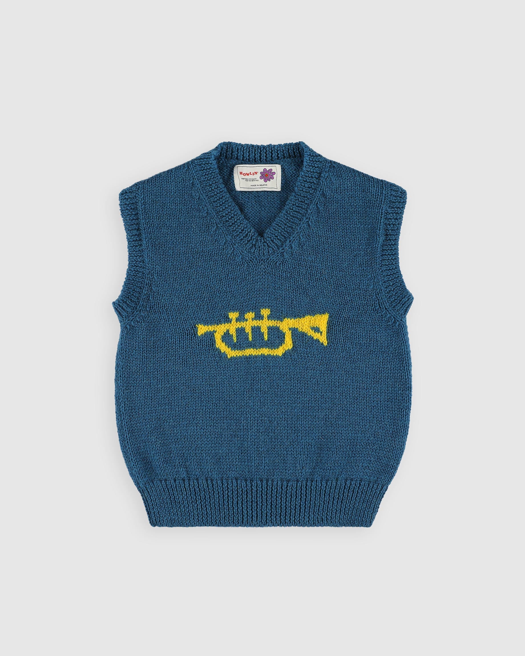 Dizzy Trumpet is a knitted slipover with a trumpet motif on the front, crafted from natural Irish pure new wool in Ireland.
