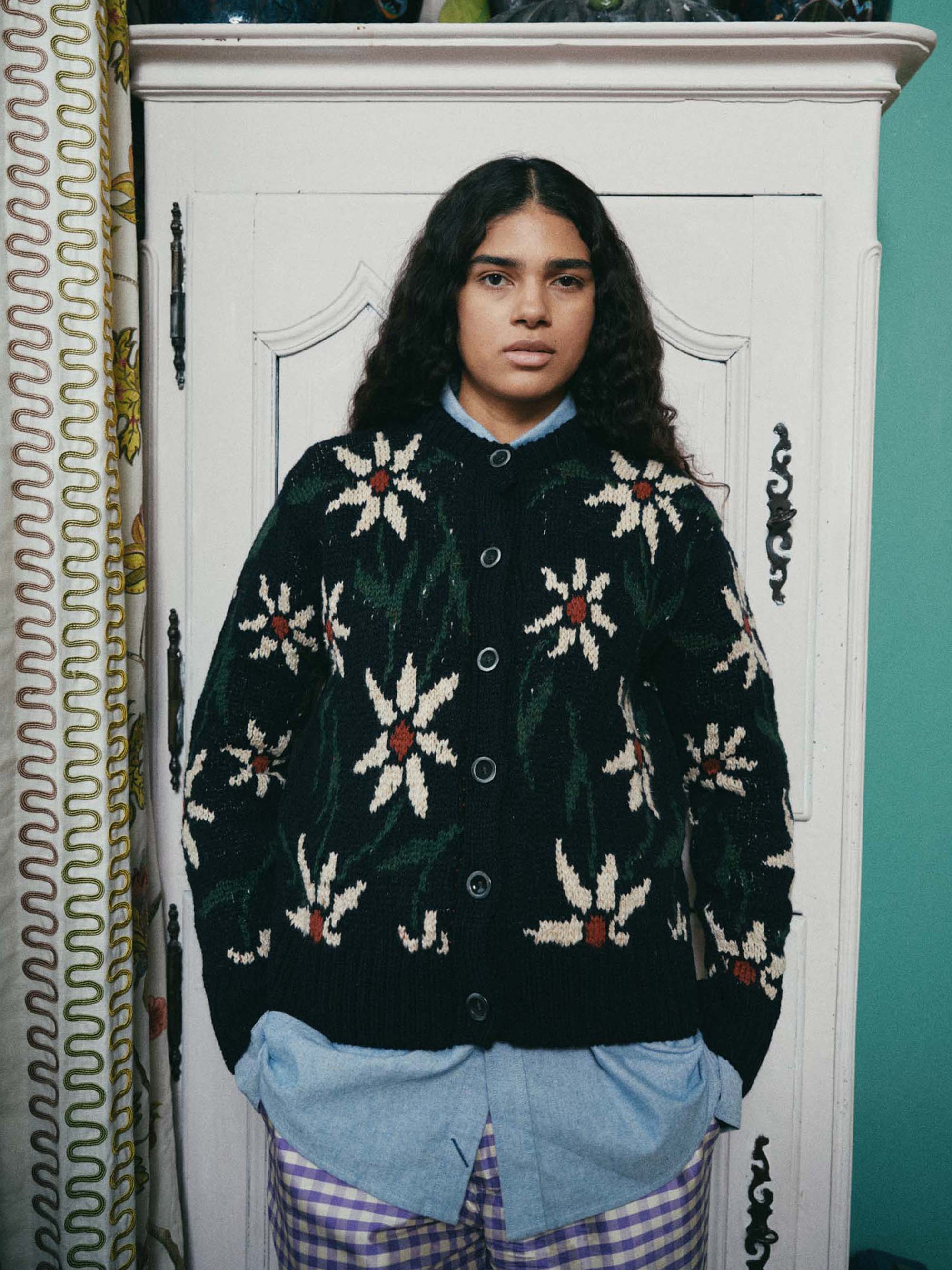 Add a playful twist to your winter wardrobe with Flower Cardigan. A joyful cardigan from Howlin’ that brings a burst of botanical charm to cold-weather dressing. Featuring bold, oversized floral patterns and a classic button-up silhouette, this knit blends nostalgia, craftsmanship, and personality in equal measure.