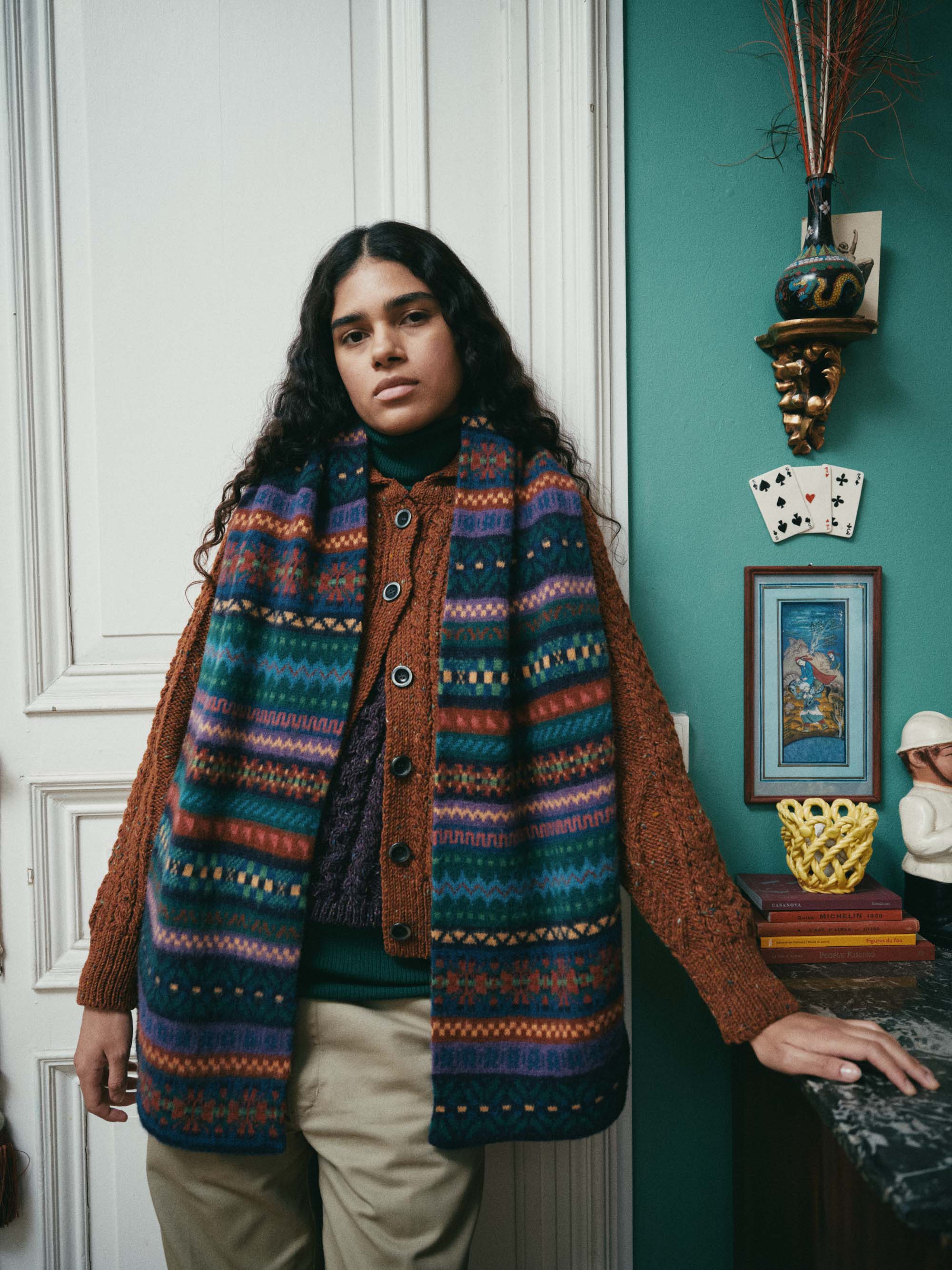The Future is Mixed up Scarf is a multicoloured jacquard-knitted scarf.