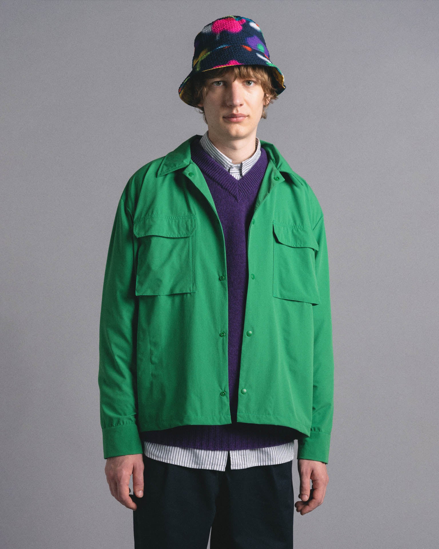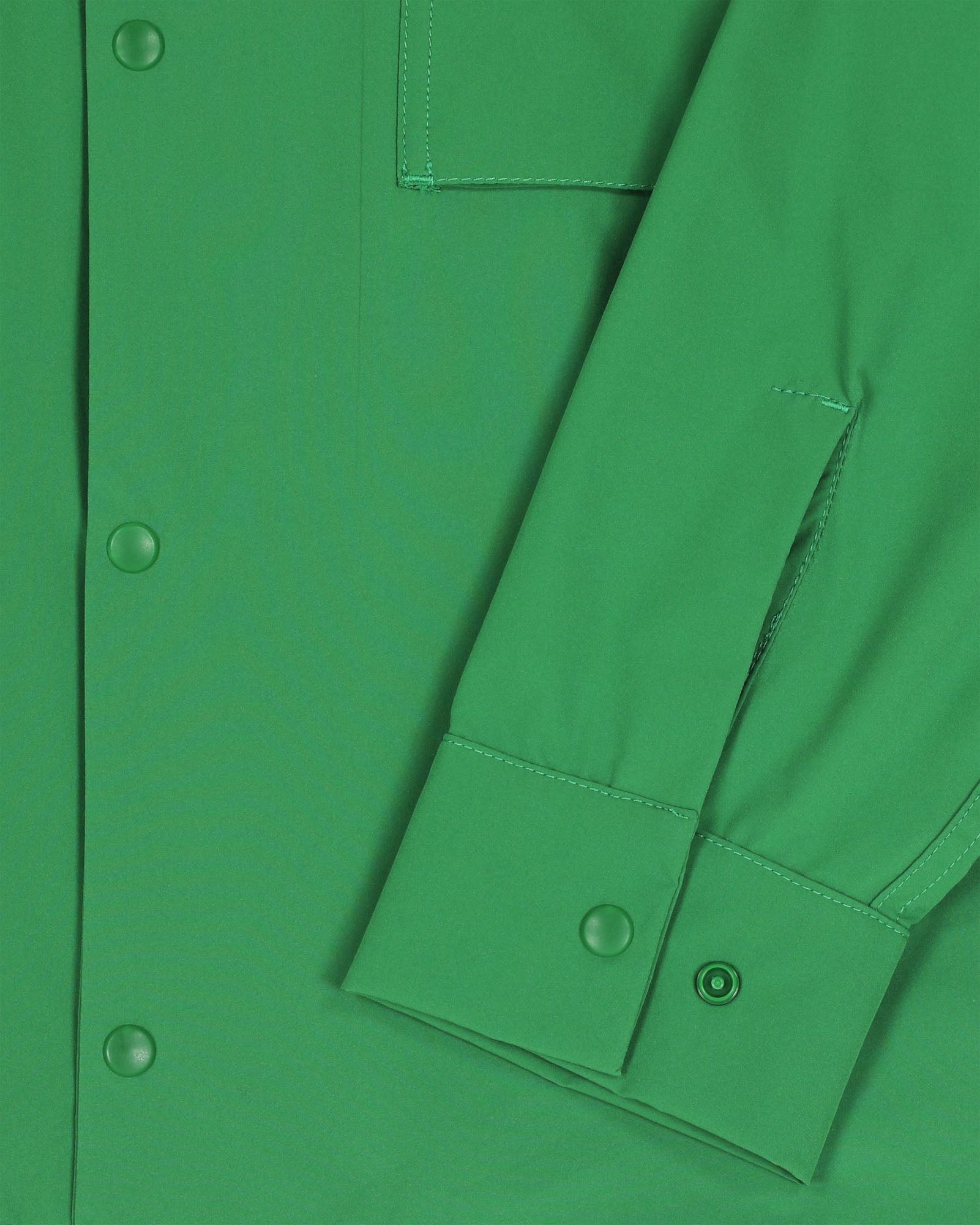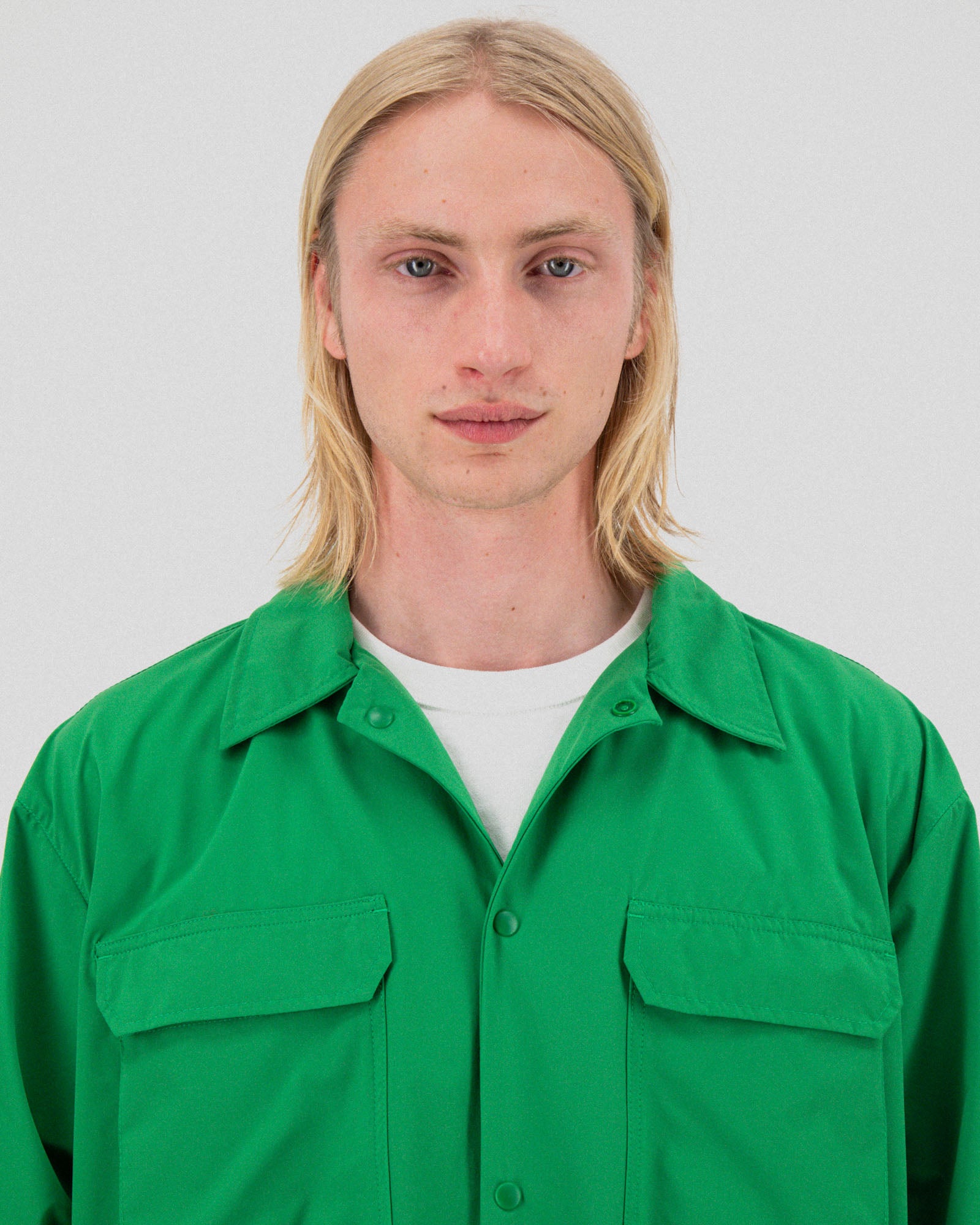 Hidden Shirt is a water-repellant shirt with a Japanese snap-button closure and two chest pockets.