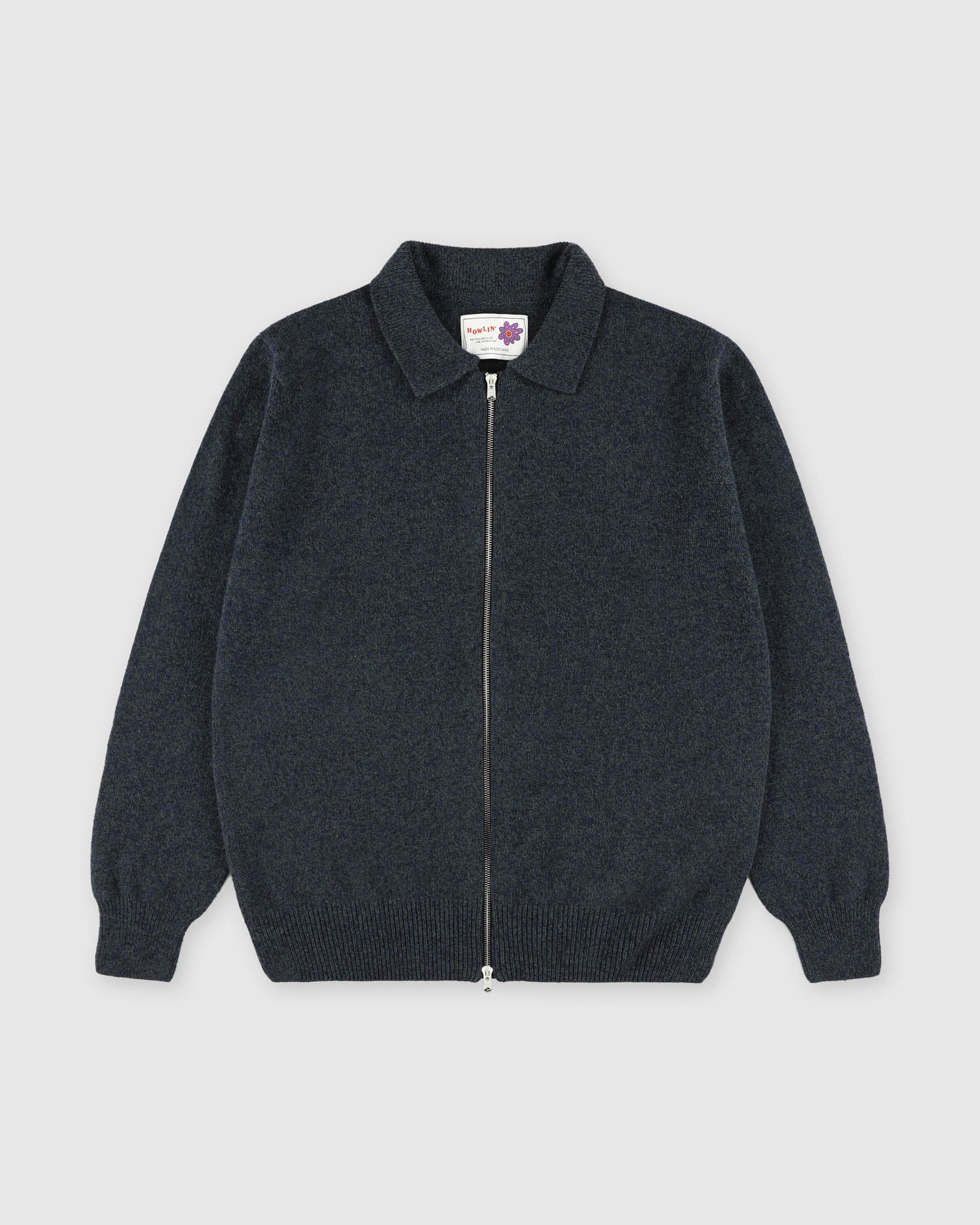High Pressure is a double-zip collared cardigan, expertly knitted in Scotland using our exclusive marled lambswool—each piece blending two distinct yarn colors. The palette ranges from soft, muted hues to bold, vibrant tones.