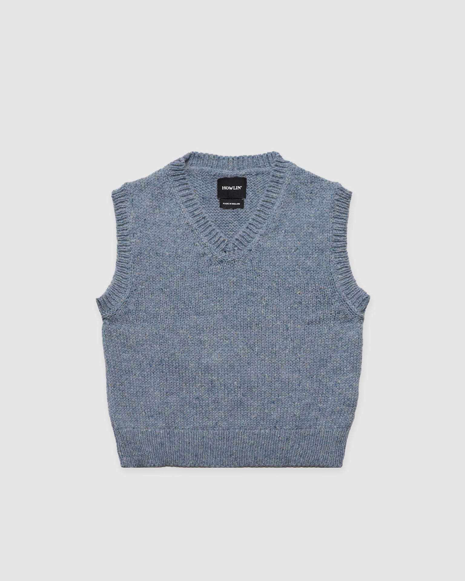 Lost my Sleeves is a knitted V-neck slipover knitted from a natural wool-mohair blend in Ireland.