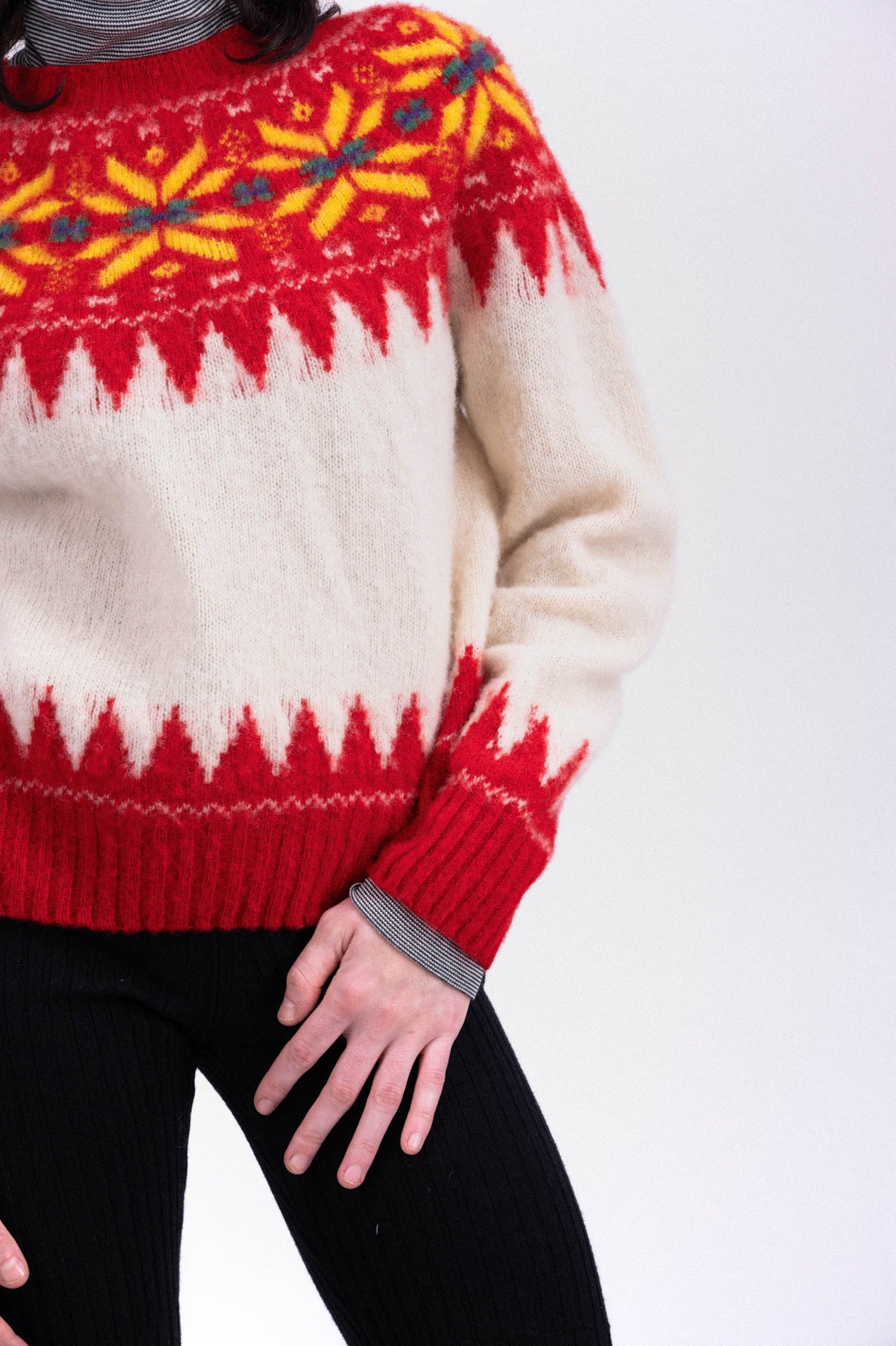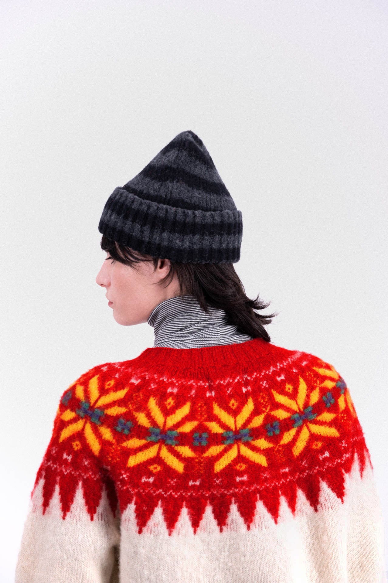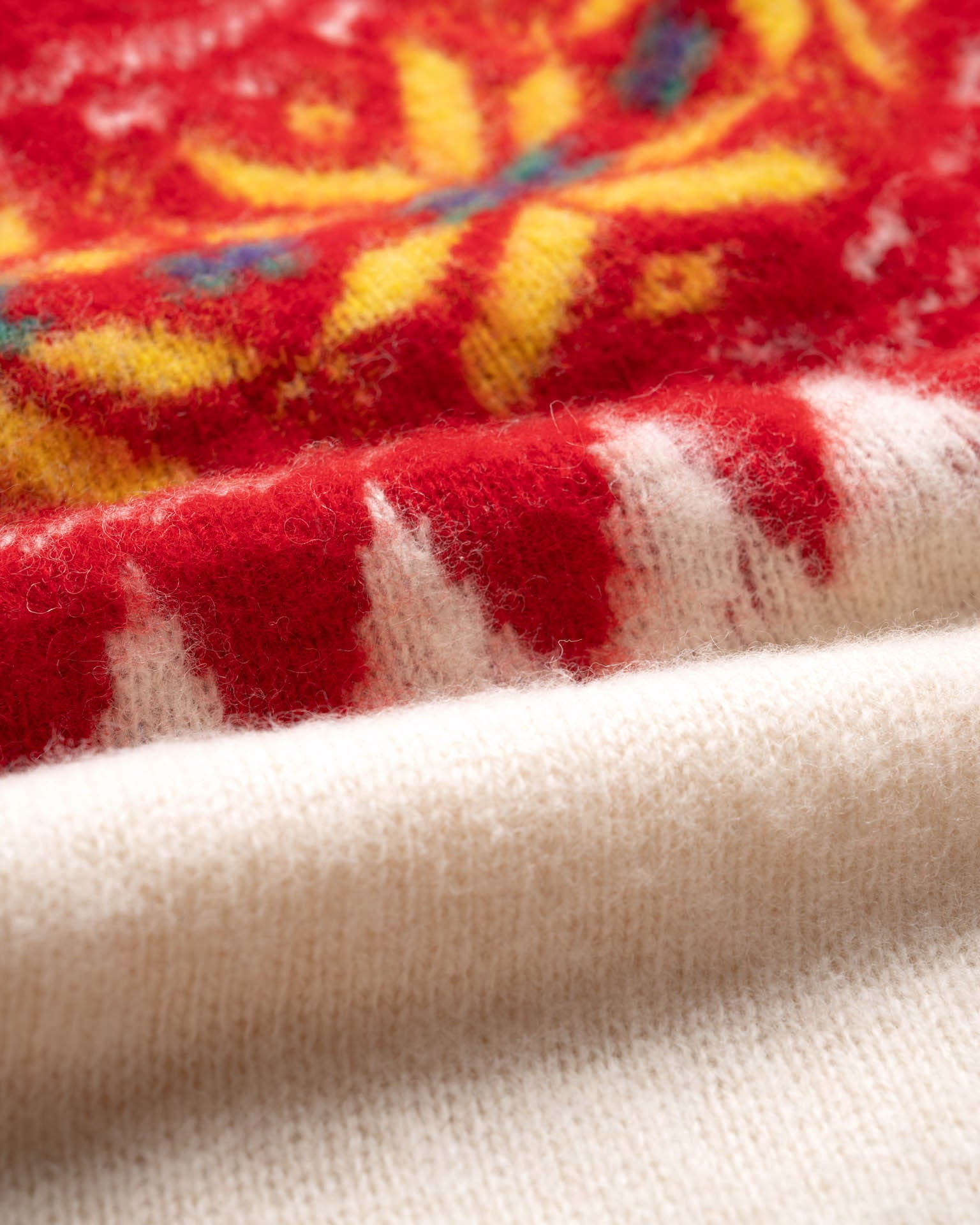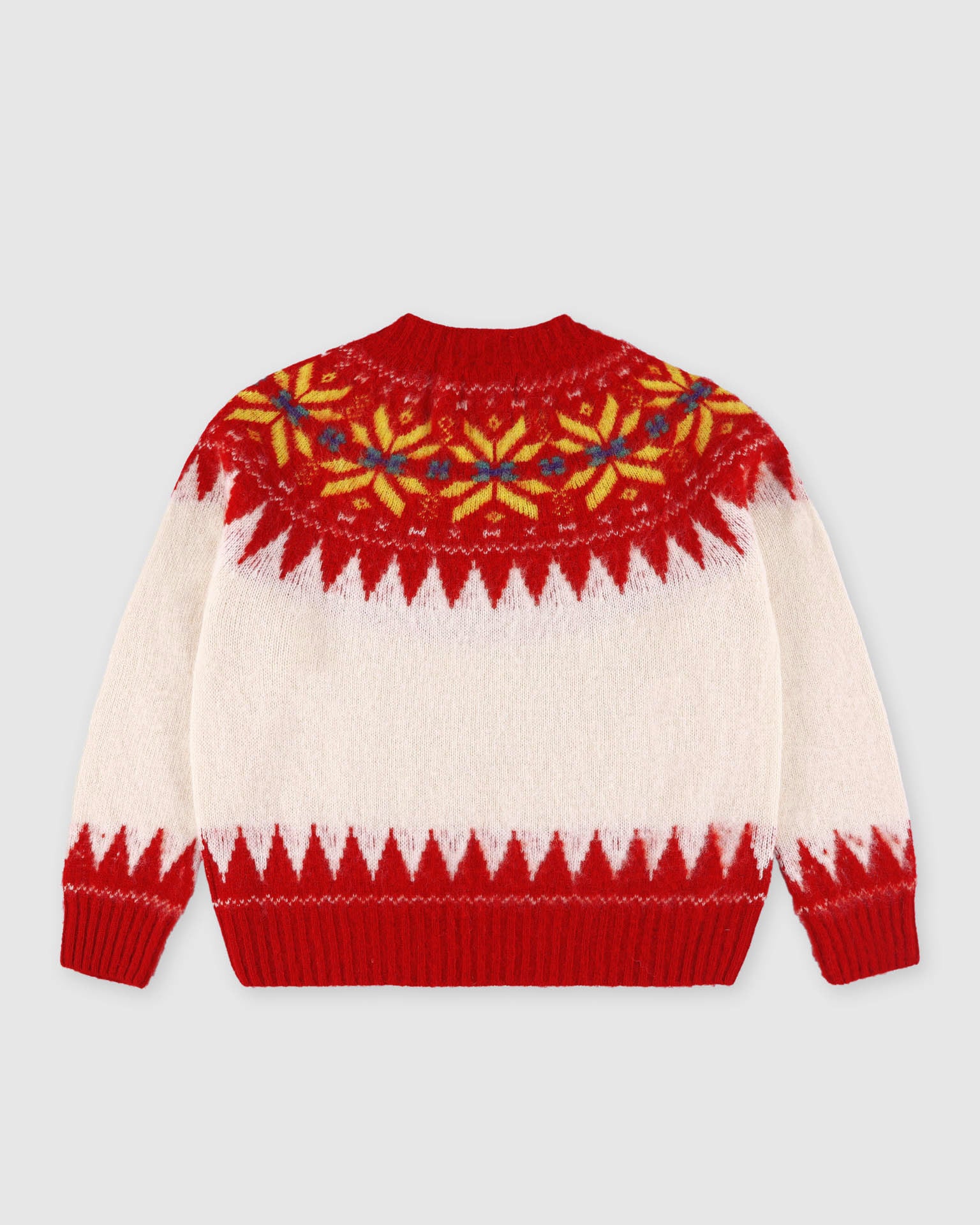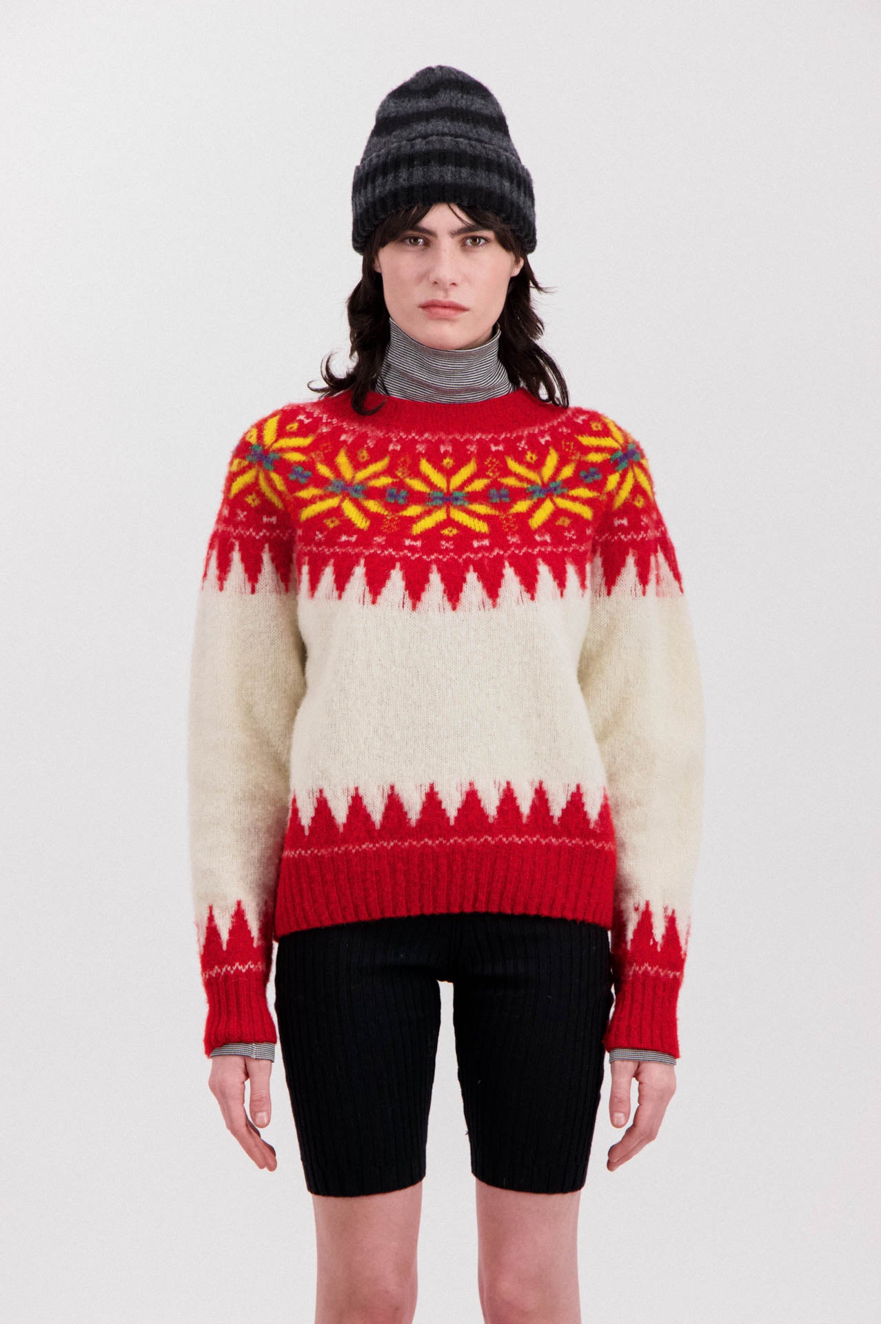 Love on a Knitted Train is a crewneck pullover that combines distinctive pattern work with refined Scottish craftsmanship, featuring a traditional jacquard yoke, hem, and cuffs.