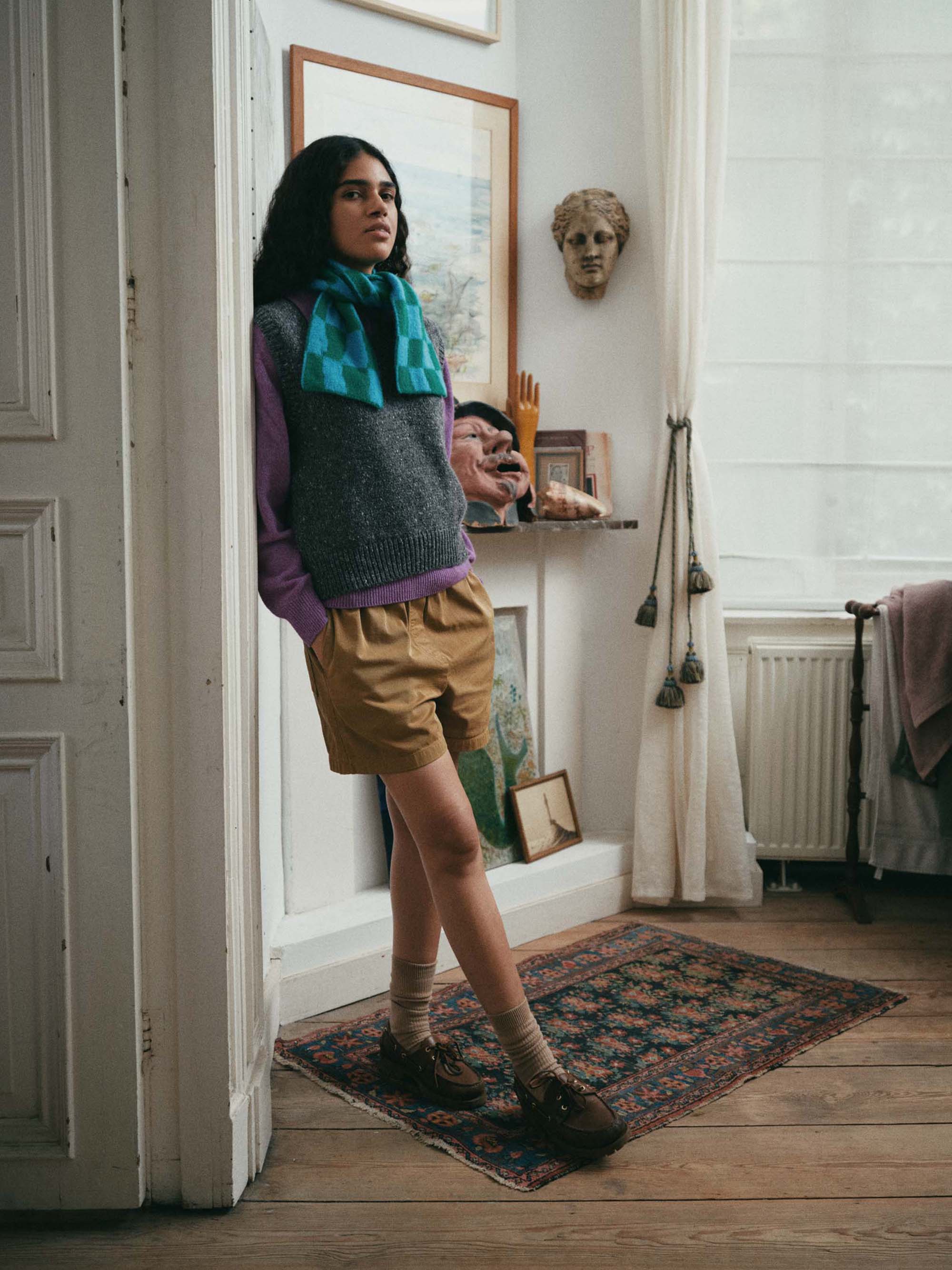 It's crafted in Scotland with a 100% natural lambswool yarn. Our lambswool comes from the first shearing of the Merino breed of sheep, which is known to produce the softest and finest wool. This natural wool is considered the most reusable and recyclable apparel fibre on the planet. Above all, it can breathe, is elastic, gives natural odour control, warms us when we are cold, and cools us when we overheat.