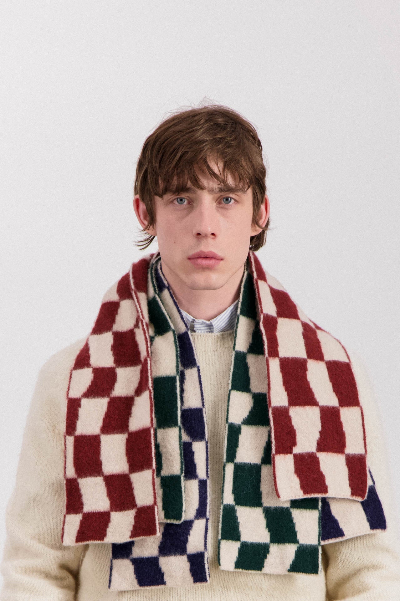 Featuring a bold warped checkerboard pattern, the Mini Checkerboard Scarf is a graphic essential from Howlin's autumn-winter collection.