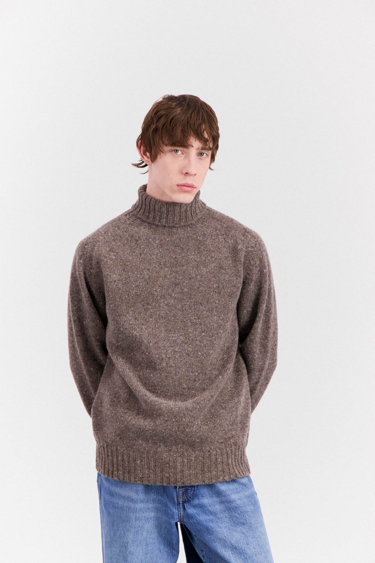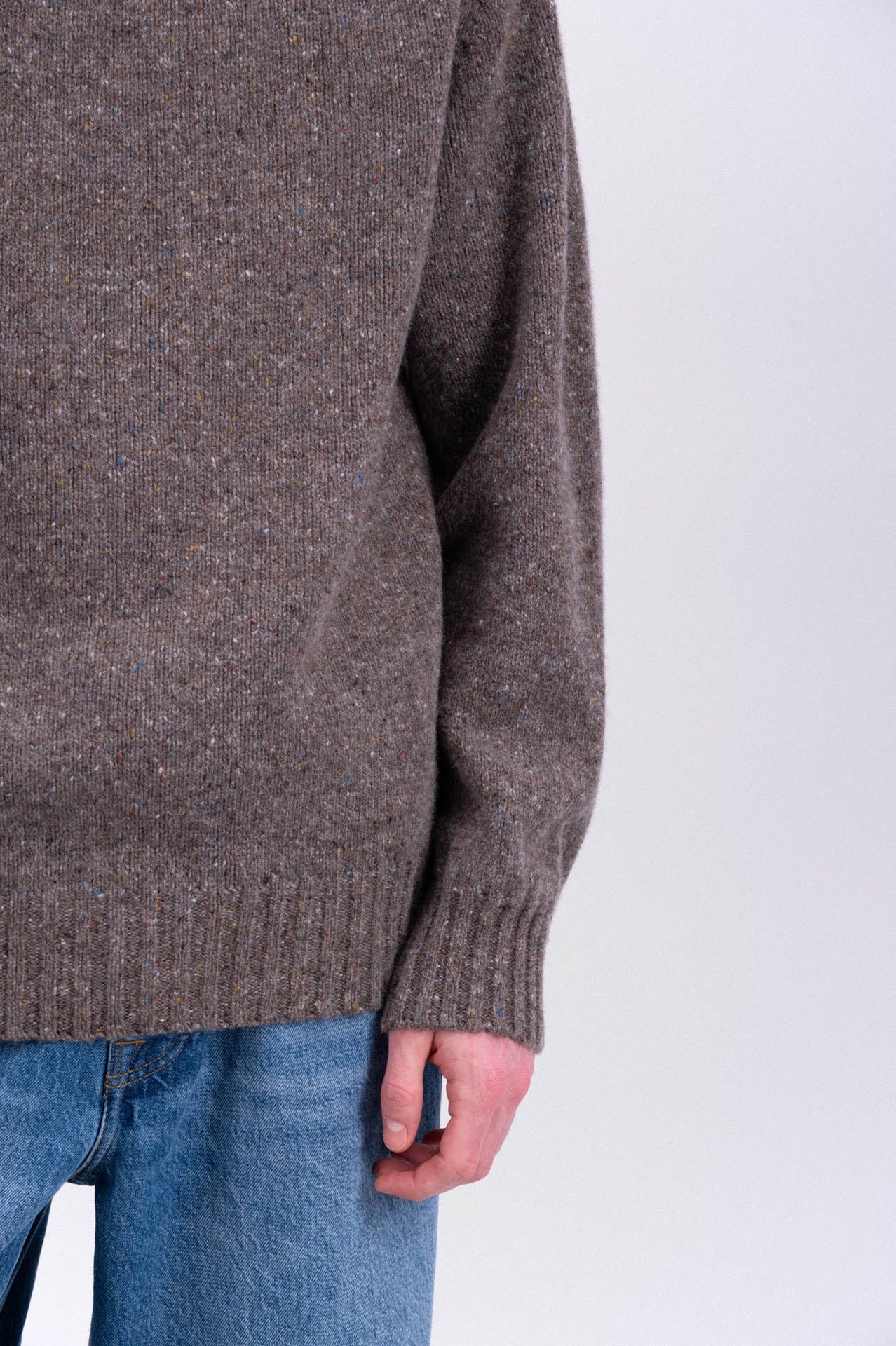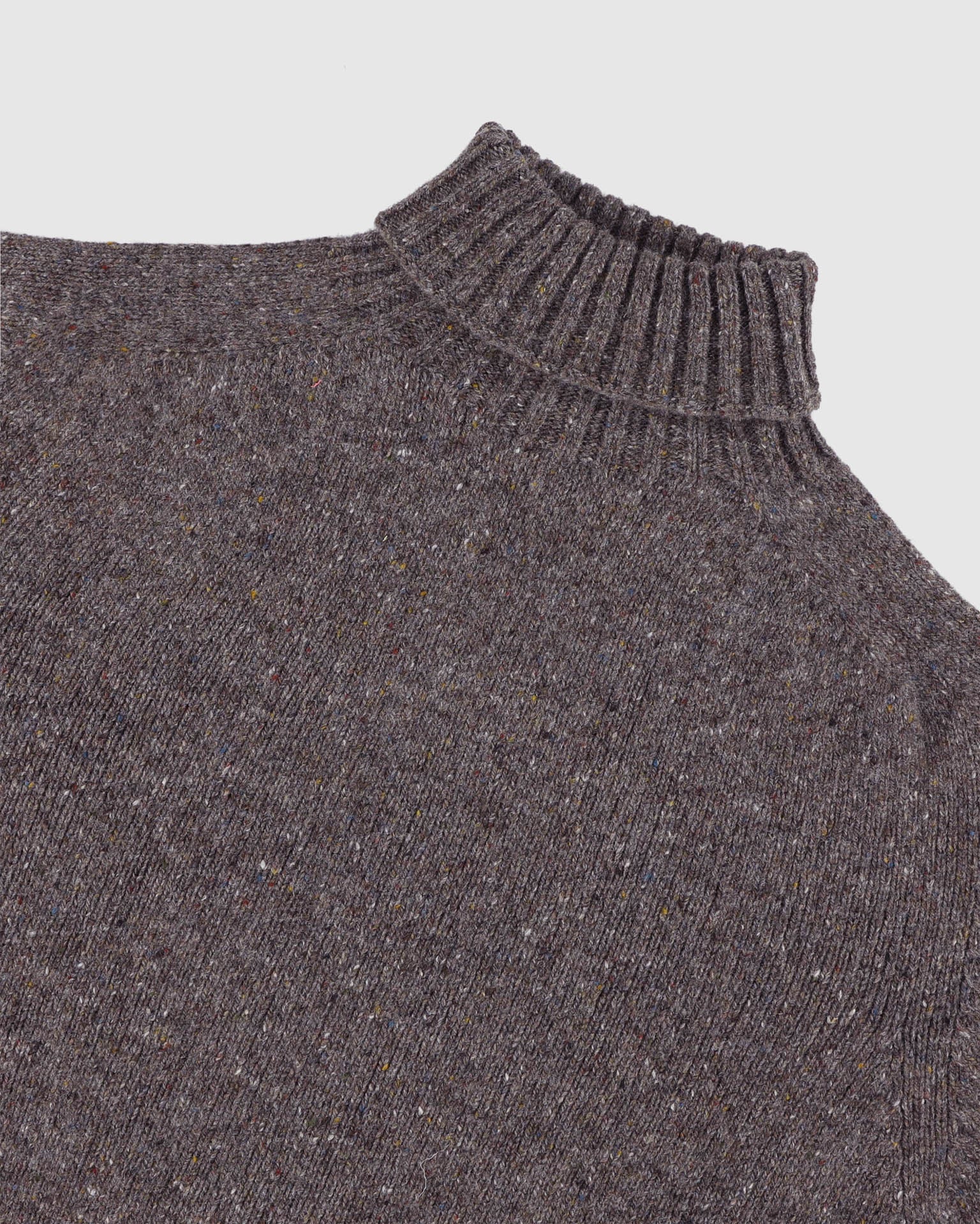 Spun from a unique flecked yarn, this sweater showcases subtle multicolored accents that are embedded into the yarn during the spinning process. These small, colorful fibers create a rich visual texture and lend each piece a distinct character.