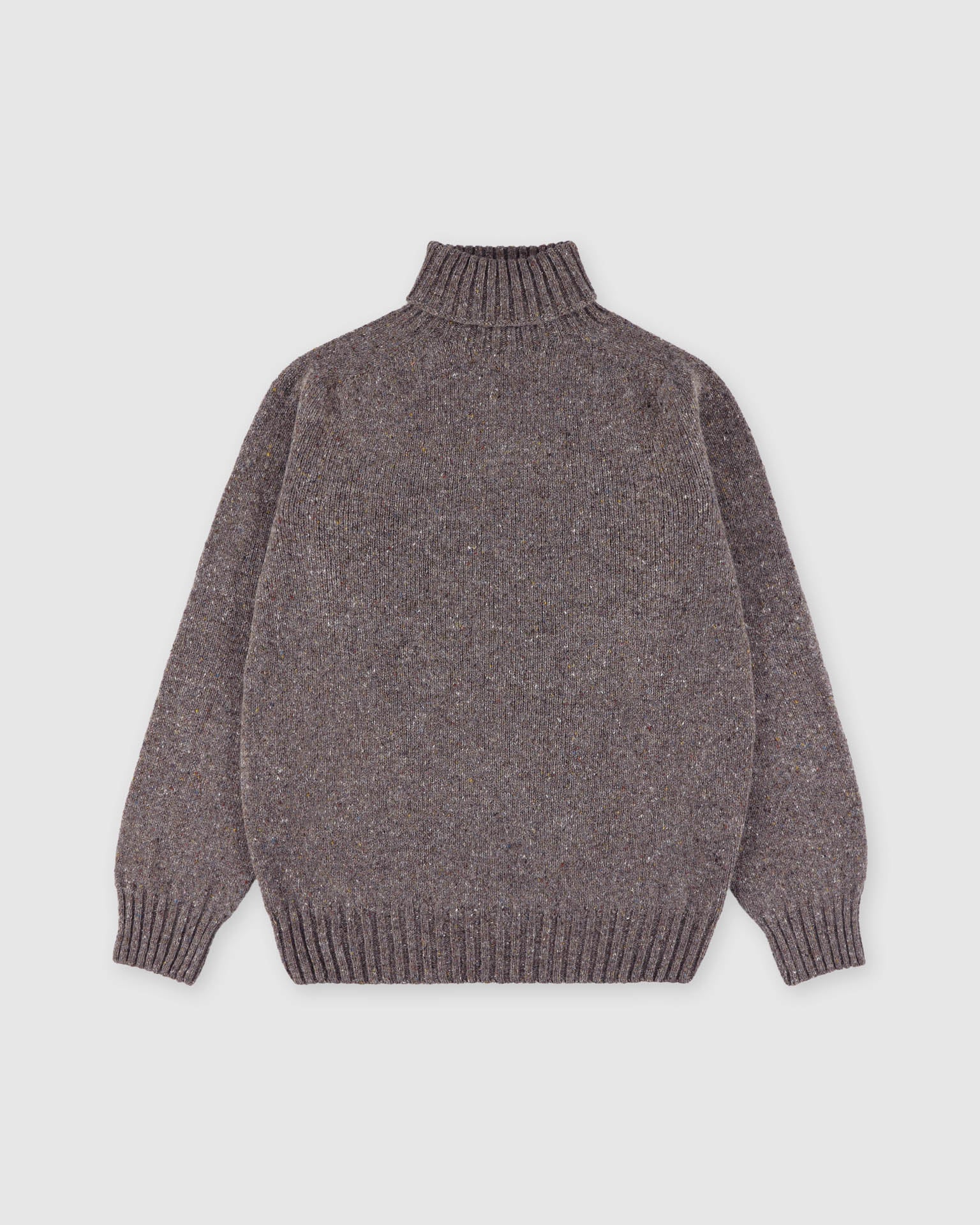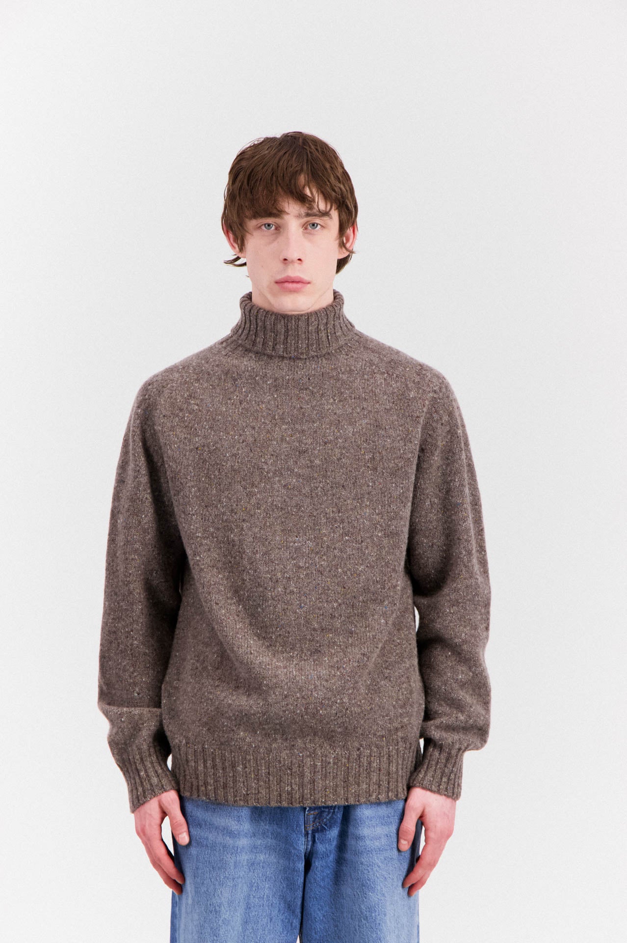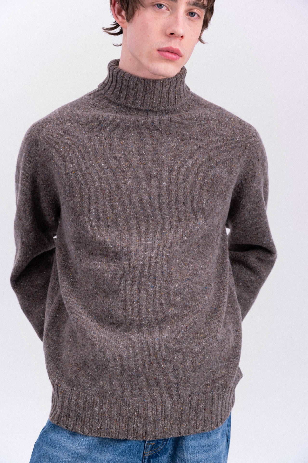 Spun from a unique flecked yarn, this sweater showcases subtle multicolored accents that are embedded into the yarn during the spinning process. These small, colorful fibers create a rich visual texture and lend each piece a distinct character.