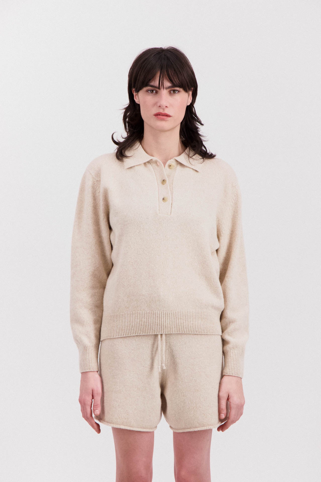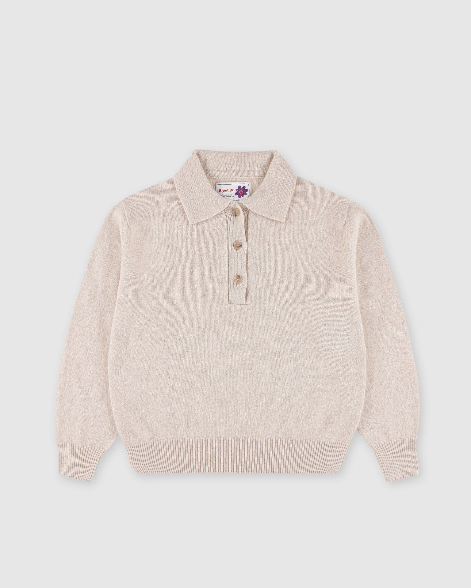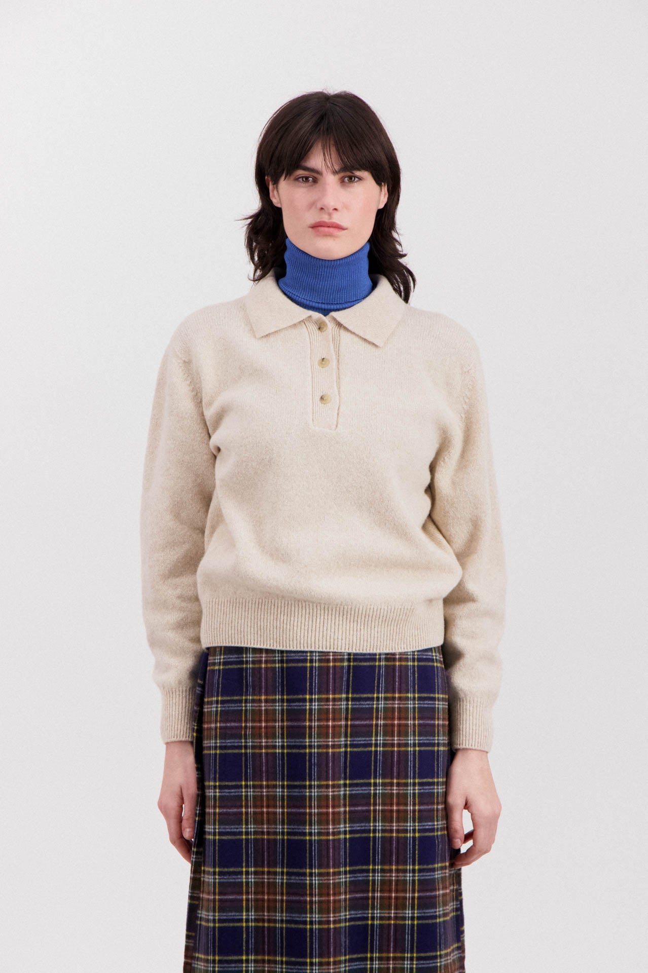 Poems of Comfort is a polo-style sweater with a relaxed fit and ribbed cuffs and hem, knitted in Scotland from 100% pure fine lambswool.