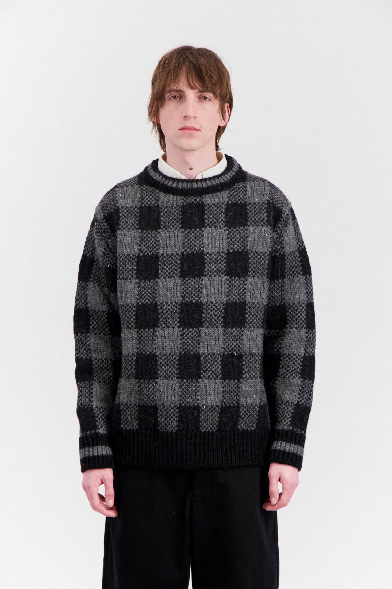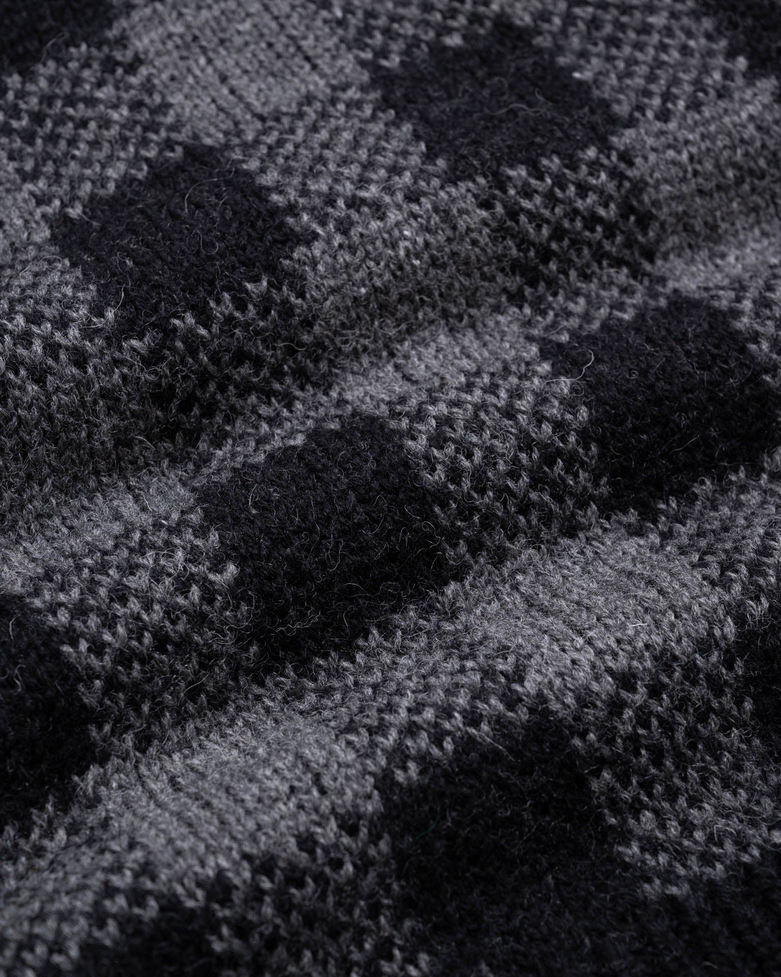 Knitted in Scotland from 100% fine wool, this piece combines warmth, softness, and understated style in equal measure. The monochrome plaid pattern adds texture and depth, while subtle details—like the tonal stripe on the cuff—set it apart from the ordinary.