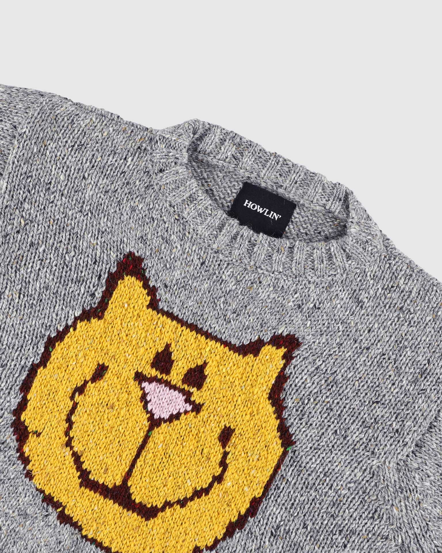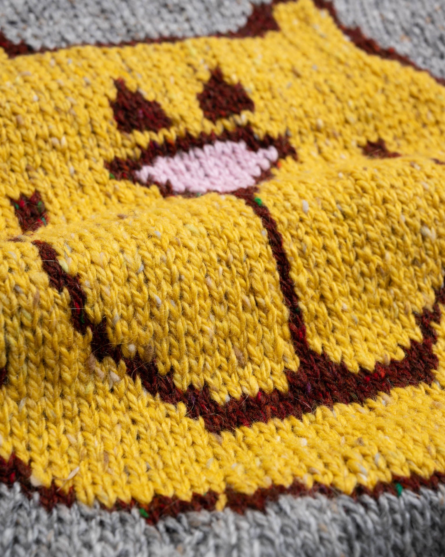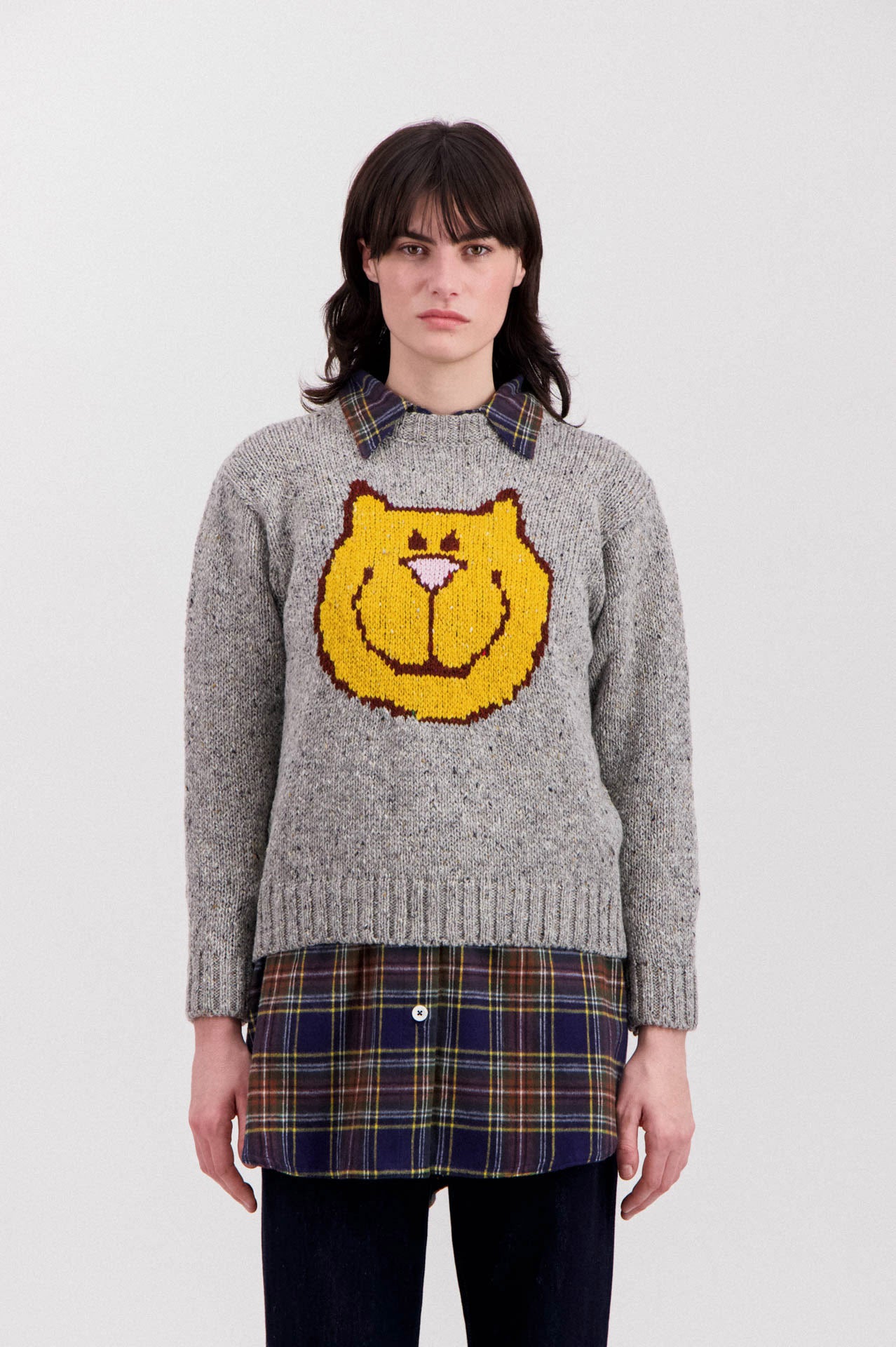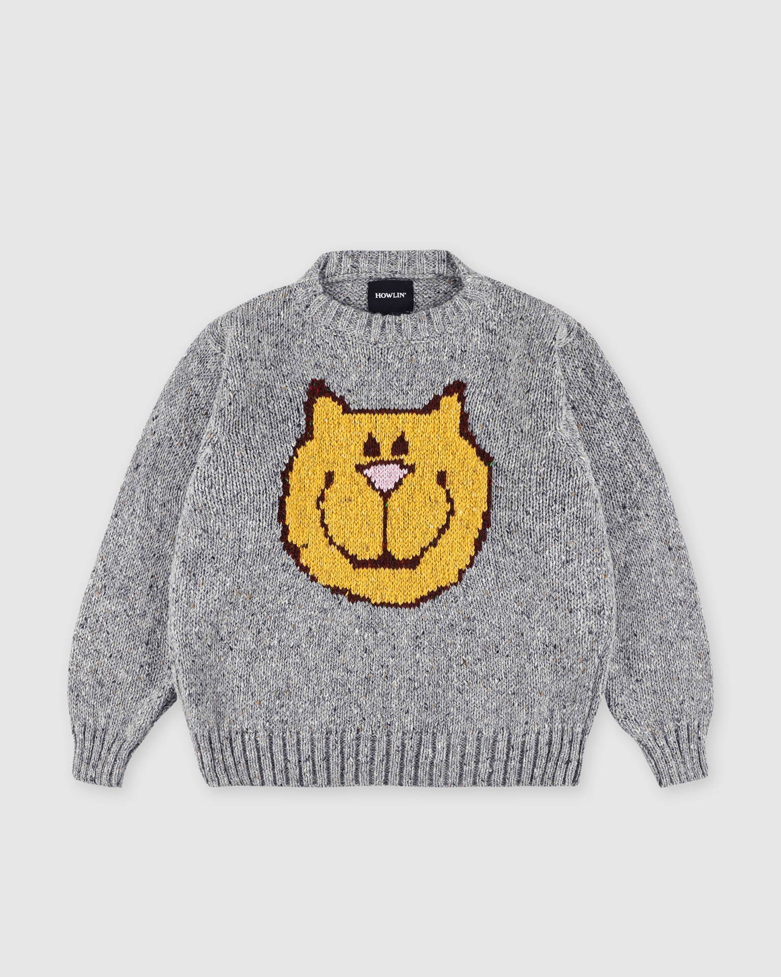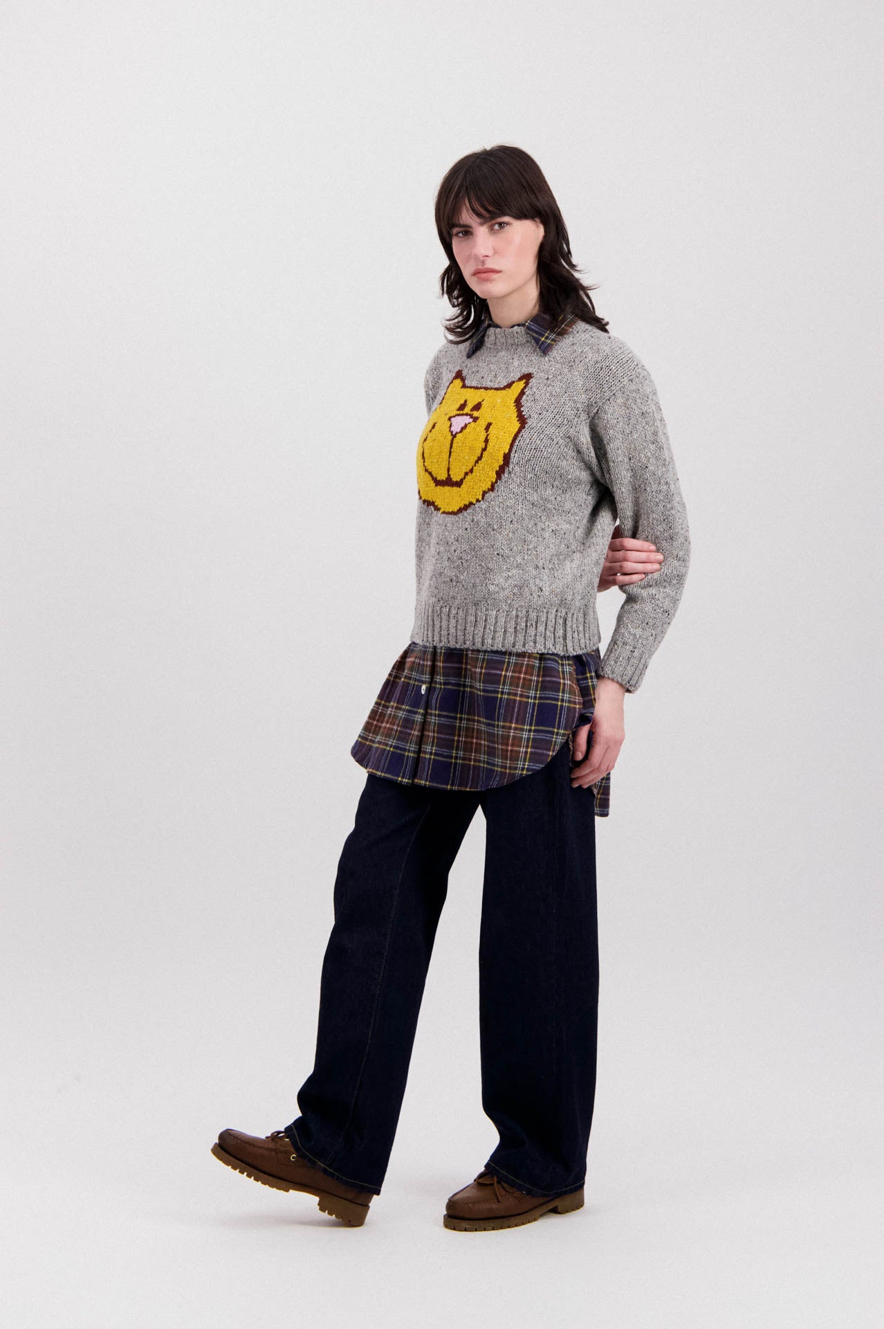 One can't help but smile while wearing Smiling Faces. A simple, charming crewneck by Howlin' featuring a knitted cat motif.